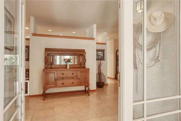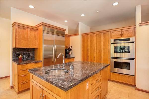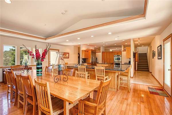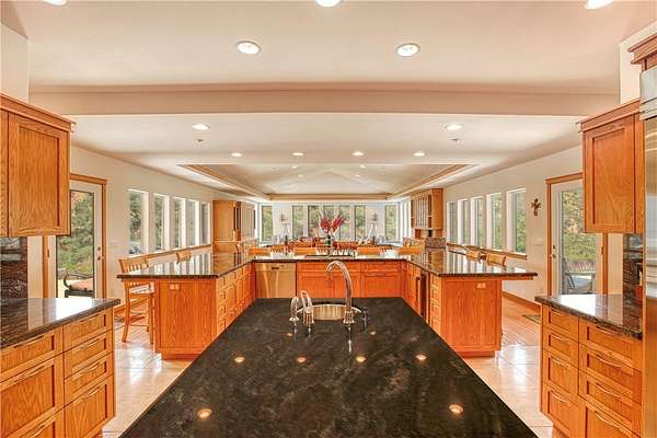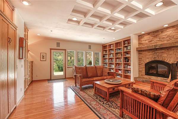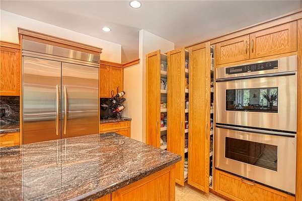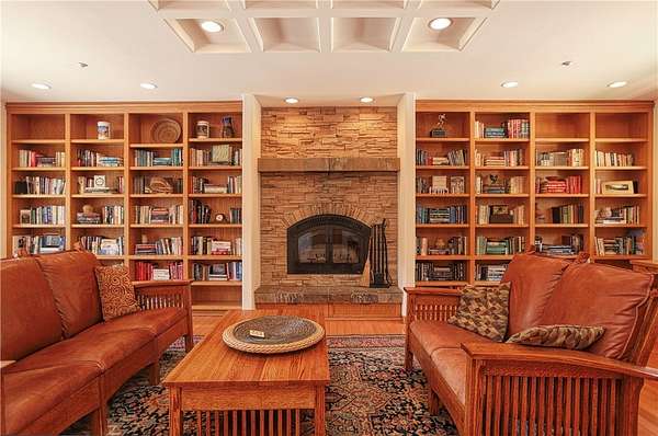 A chef's dream, the gourmet kitchen boasts a flour and sugar drawer, a sliding cabinet pantry, veggie sink, double oven, and expansive counter seating for up to eight. Dining room ideal for gatherings. It opens seamlessly into a spacious great room adorned with custom maple cabinetry, a warm fireplace, and built-in window seat storage with surround sound--perfect for entertaining or quiet nights in.