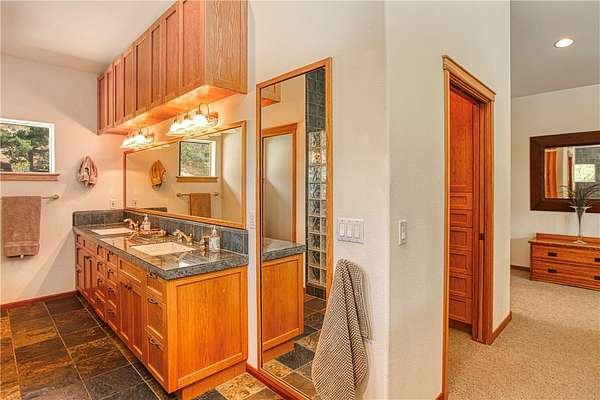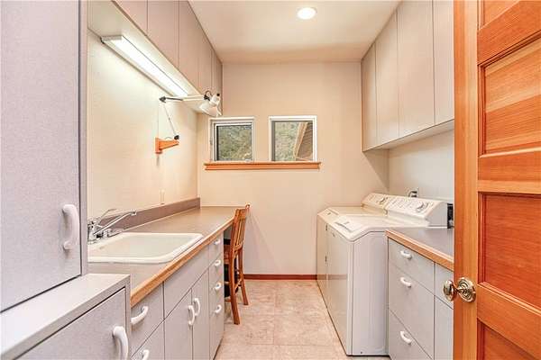 Two bedrooms are located on the main level, while the luxurious upstairs primary suite offers added privacy. Every bedroom is outfitted with custom built-in desks and dressers for a clean, integrated feel.