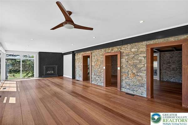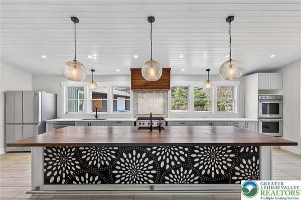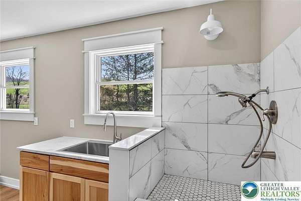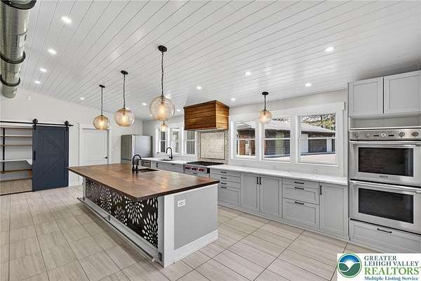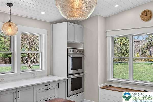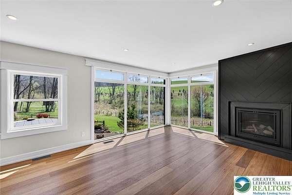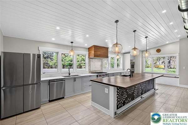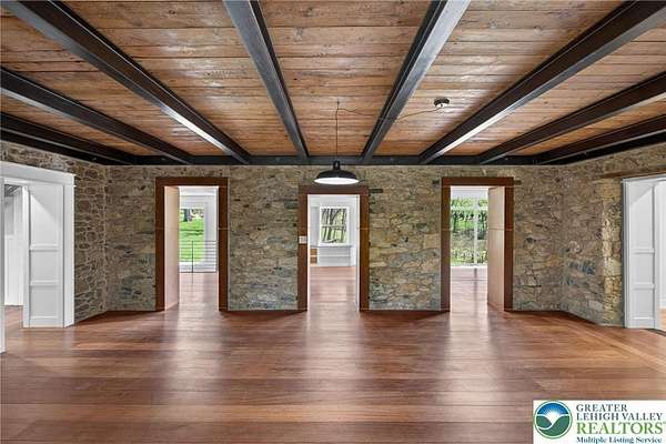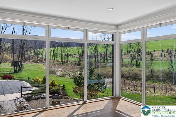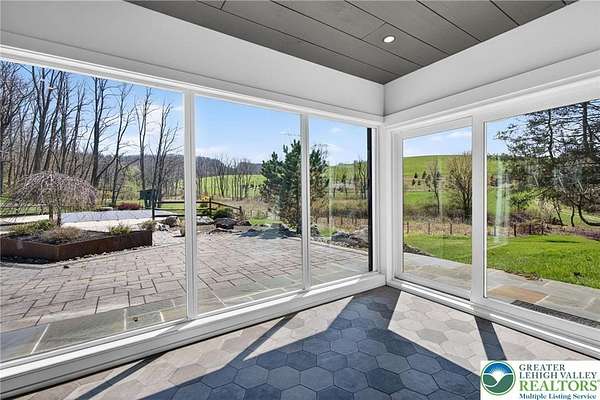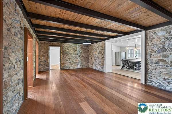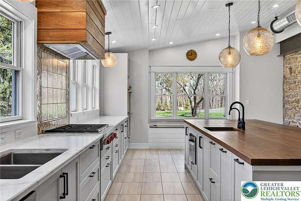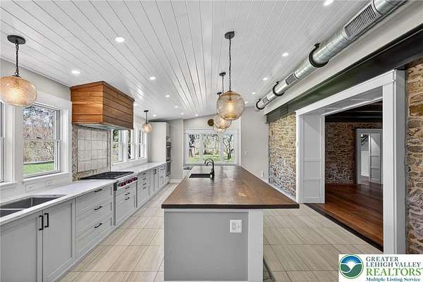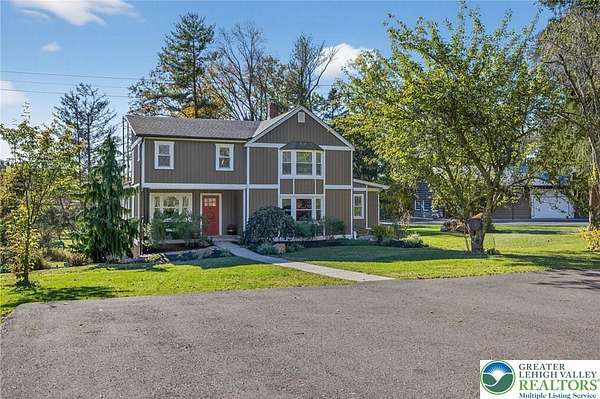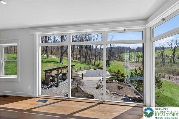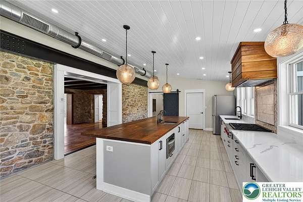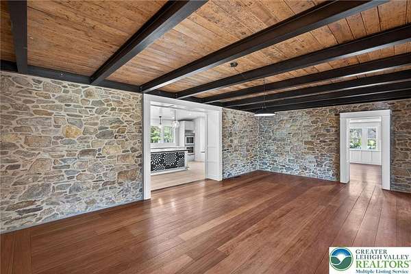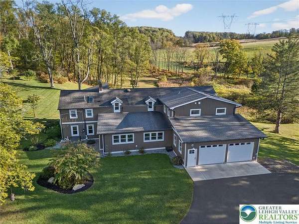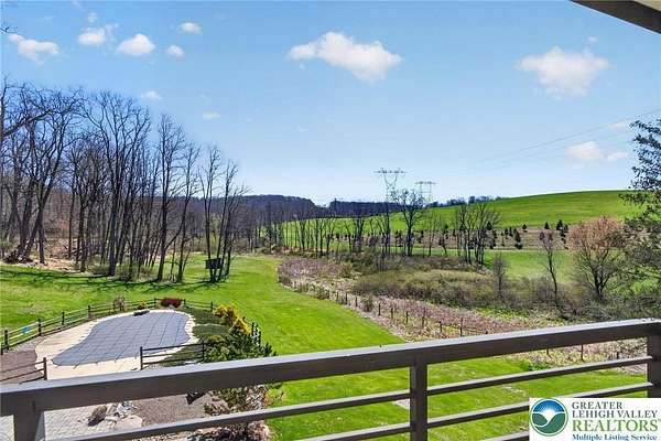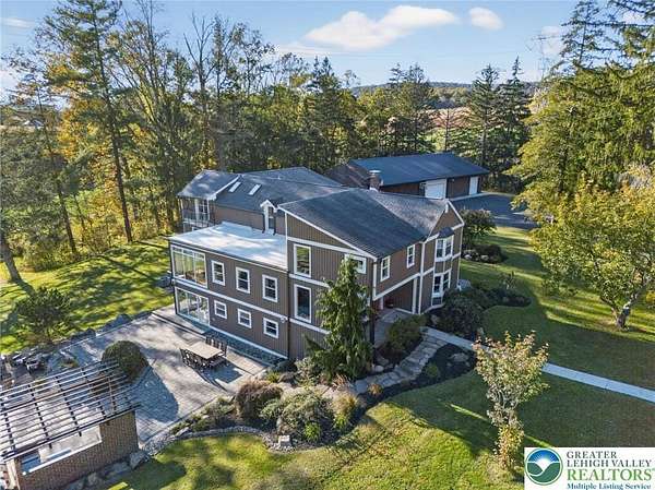 Set on over 9 private acres with sweeping countryside views in Southern Lehigh School District, this exceptional property blends the historic character of an 1880s stone farmhouse with modern design and thoughtfully curated spaces throughout. Portions of the homes original fieldstone have been carefully exposed and highlighted, creating a striking mix of historic charm, modern farmhouse style, and industrial inspired accents.A private driveway leads to the home, where the main living spaces are designed to showcase the landscape beyond. The living room is truly remarkable, featuring floor to ceiling windows that frame panoramic views of the property and fill the space with natural light. A gas fireplace anchors the room, while the scale of the space creates an impressive setting for both everyday living and entertaining.The spacious chefs kitchen has been thoughtfully updated and serves as the heart of the home. Designed for both everyday living and gathering, it features stainless steel built in appliances, a Wolf six burner gas range, double ovens, and an oversized center island topped with a striking black walnut countertop, complemented by custom metal detailing and statement lighting above. Natural stone accent walls, a built in bench, and a spacious pantry with sliding barn doors add both warmth and character to the space.The dining room continues the homes distinctive design with exposed wood ceiling beams and natural stone walls, creating a space that feels both timeless and inviting.A separate den or study offers a cozy secondary living space with a wood burning fireplace, wainscoting, and additional custom metal accents. The main level also features an exceptional mudroom and laundry area located just off the garage, offering abundant space, built in bench seating, and a convenient dog wash station, making it as functional as it is impressive. A half bath completes this level.Upstairs, the primary suite captures peaceful views of the propertys pond and creek. The spacious en suite bath features a soaking tub, double vanity, skylights, and a walk in closet. Four additional bedrooms are located along a bright hallway and each features cathedral ceilings, creating airy, light filled spaces. A full bathroom with a walk in shower and skylight serves the additional bedrooms on this level.The finished walk out lower level adds even more flexibility with a large open recreation area that leads directly to the backyard patio, creating an ideal space for a game room, media room, or additional entertaining area. This level also includes a full bath and a private office.Outdoor living is just as impressive as the interior. The backyard has been designed for gathering and relaxation with a salt water in ground pool, built in stainless steel outdoor kitchen, firepit area, and stone patio overlooking the propertys open landscape. A treehouse and chicken coop add to the charm of the grounds while maintaining the privacy and space that nine acres provide.In addition to the oversized attached two car garage with nine foot doors, epoxy flooring, and direct access into the kitchen, the property also includes a large detached outbuilding featuring a finished 33 x 20 gym area, an attached 38 x 50 garage with two 11 foot doors and built in workbench, and an additional1436 area off the garage with a separate entranceperfect for storing your farm and lawn equipment.A rare opportunity to own a property that combines acreage, privacy, architectural character, and thoughtfully designed living spaces both inside and out.