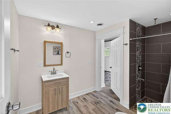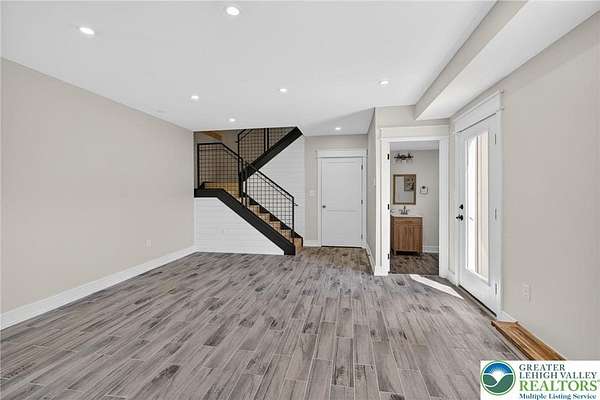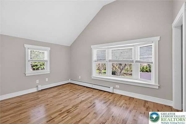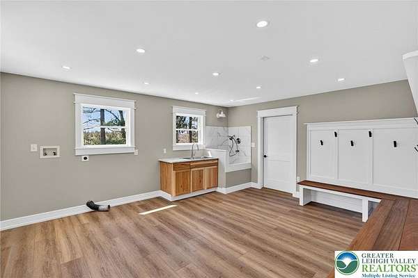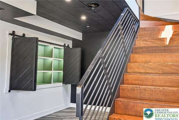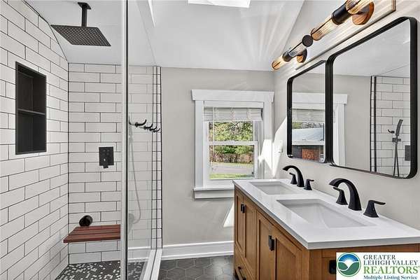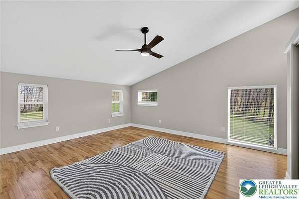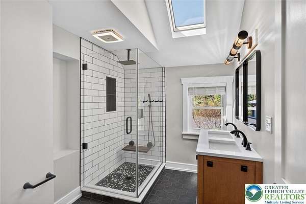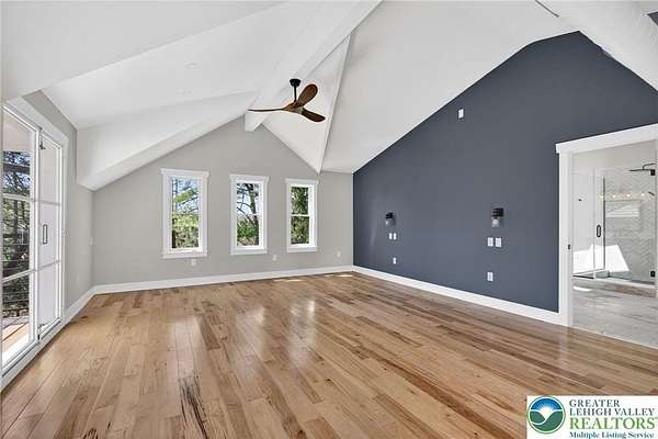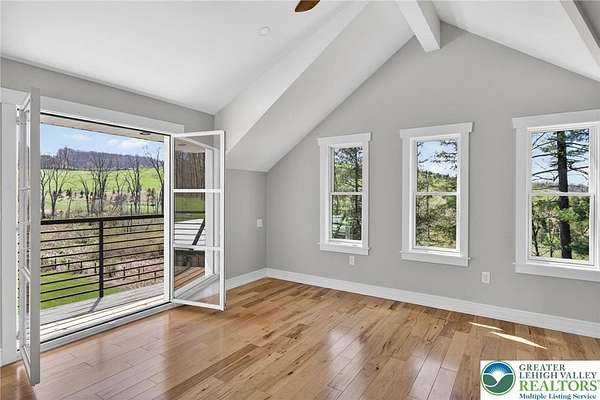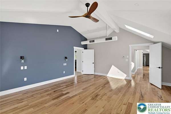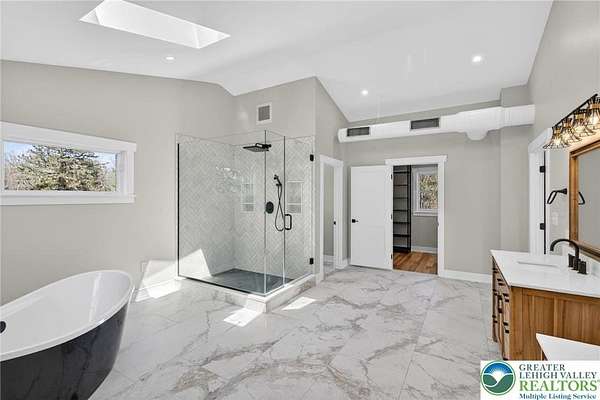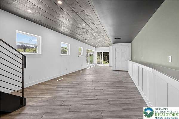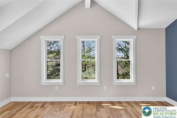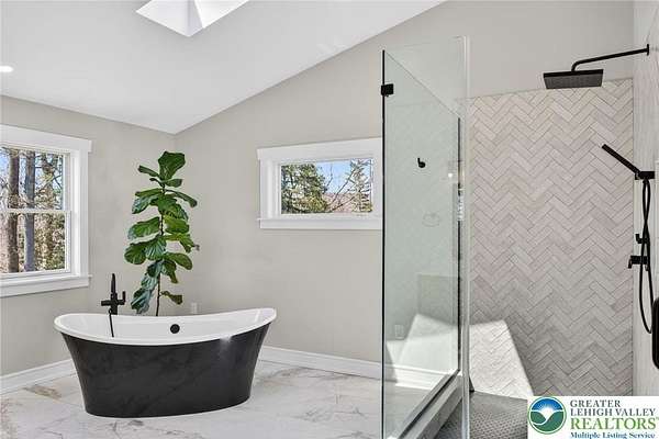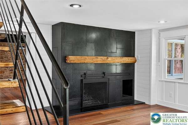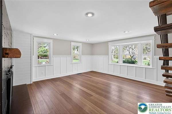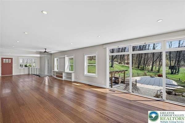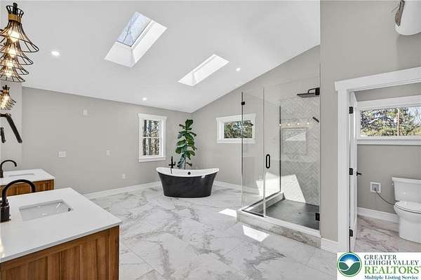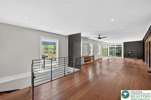 Set on over 9 private acres with sweeping countryside views in Southern Lehigh School District, this exceptional property blends the historic character of an 1880s stone farmhouse with modern design and thoughtfully curated spaces throughout. Portions of the homes original fieldstone have been carefully exposed and highlighted, creating a striking mix of historic charm, modern farmhouse style, and industrial inspired accents.A private driveway leads to the home, where the main living spaces are designed to showcase the landscape beyond. The living room is truly remarkable, featuring floor to ceiling windows that frame panoramic views of the property and fill the space with natural light. A gas fireplace anchors the room, while the scale of the space creates an impressive setting for both everyday living and entertaining.The spacious chefs kitchen has been thoughtfully updated and serves as the heart of the home. Designed for both everyday living and gathering, it features stainless steel built in appliances, a Wolf six burner gas range, double ovens, and an oversized center island topped with a striking black walnut countertop, complemented by custom metal detailing and statement lighting above. Natural stone accent walls, a built in bench, and a spacious pantry with sliding barn doors add both warmth and character to the space.The dining room continues the homes distinctive design with exposed wood ceiling beams and natural stone walls, creating a space that feels both timeless and inviting.A separate den or study offers a cozy secondary living space with a wood burning fireplace, wainscoting, and additional custom metal accents. The main level also features an exceptional mudroom and laundry area located just off the garage, offering abundant space, built in bench seating, and a convenient dog wash station, making it as functional as it is impressive. A half bath completes this level.Upstairs, the primary suite captures peaceful views of the propertys pond and creek. The spacious en suite bath features a soaking tub, double vanity, skylights, and a walk in closet. Four additional bedrooms are located along a bright hallway and each features cathedral ceilings, creating airy, light filled spaces. A full bathroom with a walk in shower and skylight serves the additional bedrooms on this level.The finished walk out lower level adds even more flexibility with a large open recreation area that leads directly to the backyard patio, creating an ideal space for a game room, media room, or additional entertaining area. This level also includes a full bath and a private office.Outdoor living is just as impressive as the interior. The backyard has been designed for gathering and relaxation with a salt water in ground pool, built in stainless steel outdoor kitchen, firepit area, and stone patio overlooking the propertys open landscape. A treehouse and chicken coop add to the charm of the grounds while maintaining the privacy and space that nine acres provide.In addition to the oversized attached two car garage with nine foot doors, epoxy flooring, and direct access into the kitchen, the property also includes a large detached outbuilding featuring a finished 33 x 20 gym area, an attached 38 x 50 garage with two 11 foot doors and built in workbench, and an additional1436 area off the garage with a separate entranceperfect for storing your farm and lawn equipment.A rare opportunity to own a property that combines acreage, privacy, architectural character, and thoughtfully designed living spaces both inside and out.