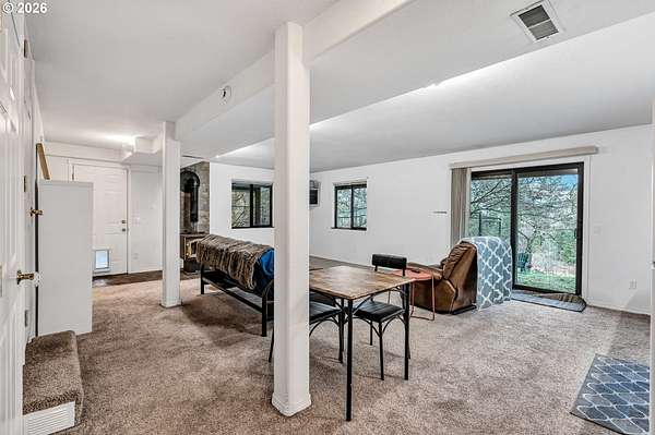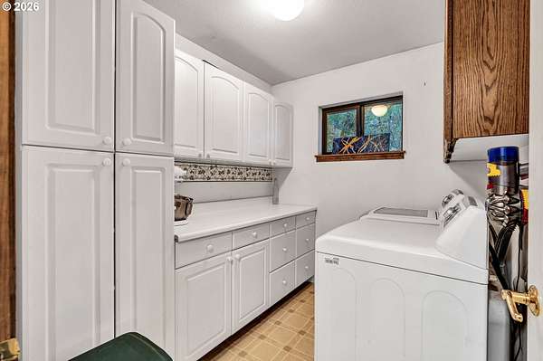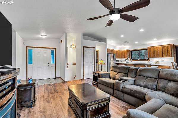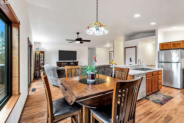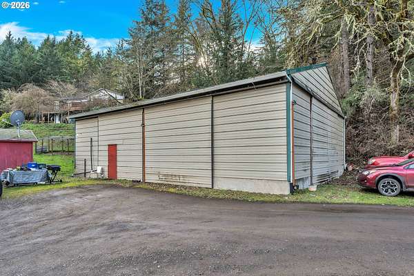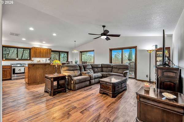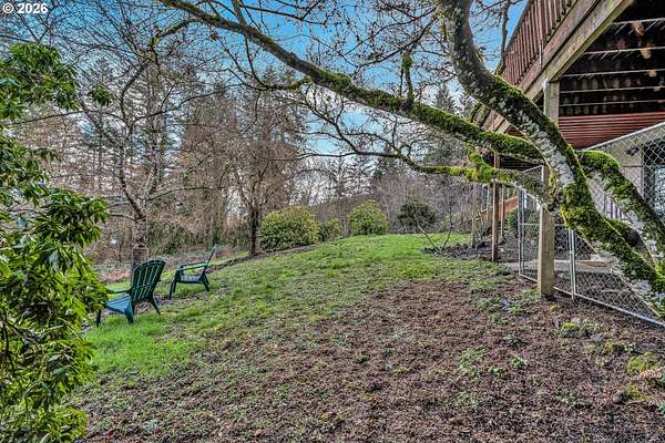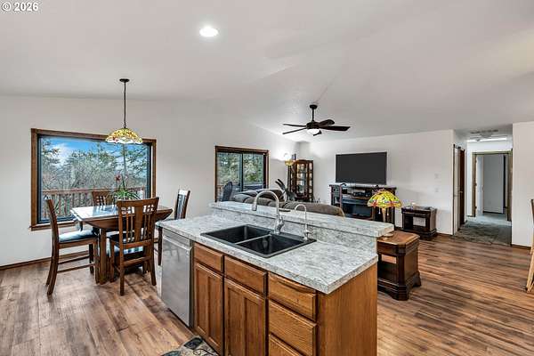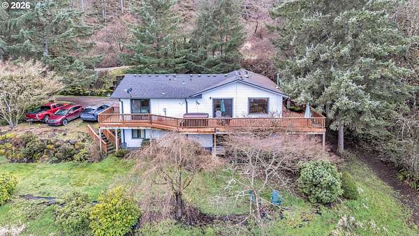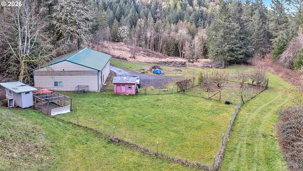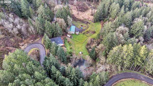 Who needs a shop? The home has a detached 40' x 50' shop with power, water, heat, and two 12-foot doors, plus RV and boat storage.This beautiful home sits on 9 private acres surrounded by forest, wildlife, and serene natural beauty, complete with a pond, garden area, mature fruit trees, chicken coop, and in-ground sprinkler system. A gravel driveway welcomes you into this peaceful retreat.The main level features an expansive open floor plan with hardwood floors, vaulted ceilings, and abundant natural light. The spacious living, kitchen, and dining areas flow seamlessly together, each with updated Andersen sliding doors leading to the wraparound deck. The generously sized kitchen offers stainless steel appliances, a gas stove, island with eat bar, and ample space for gatherings and everyday living.Three bedrooms are located on the main level, including the primary suite with a walk-in closet, ensuite bath, ceiling fan, and private deck access. The home offers a total of 2.5 baths, with 1.5 baths on the main level and a full bath on the lower level. Downstairs provides incredible flexibility with a large family room and potential for dual living. Major updates include new windows(approximately 4 years old), a roof(4 years old), leaf guard gutters, and an efficient heat pump with A/C for year-round comfort.The property also features a The extra finished area located within the shop still preserves full shop functionality for everyday use.With expansive grounds, peaceful surroundings, and endless possibilities.