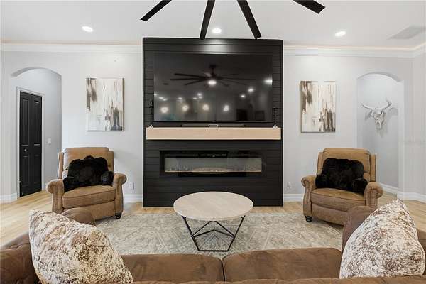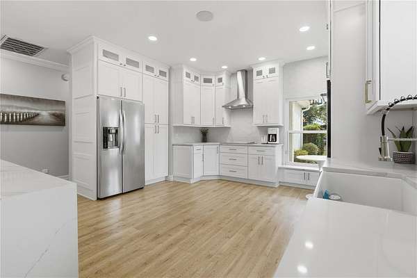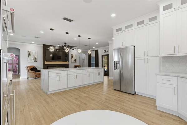 - Crown Molding, Eat-In Kitchen, Kitchen/Family Room Combo, Solid Surface Counters, Solid Wood Cabinets, Split Bedroom