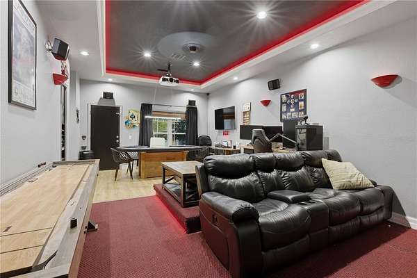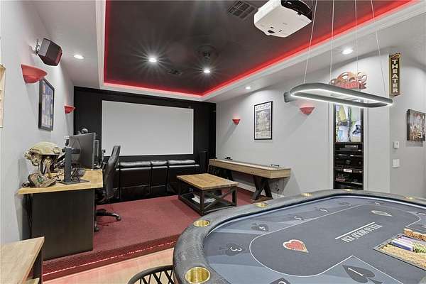 Versatile 30x40 metal garage multi-purpose space that works as a workshop, storage area, home-business hub, or hobby studio! Plumbed bathroom, and A/C-ready separate space. Entertainment lovers can relax in the home theatre featuring a 136" screen, surround sound, and a full bathroom. The fenced playground area, outdoor security cameras, and no HOA complete this exceptional property.
