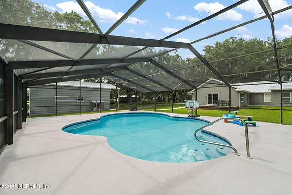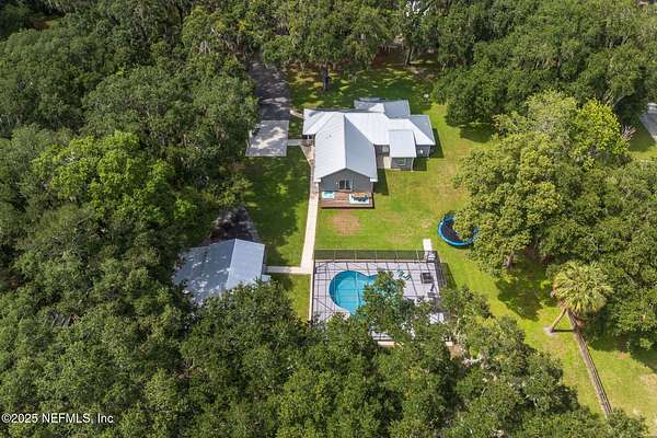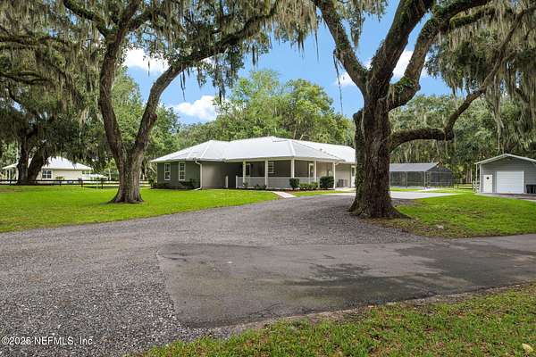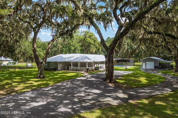 Nestled beneath a canopy of majestic oak trees, this private estate offers the perfect blend of tranquility and modern comfort. Situated on nearly 2 acres with no HOA or CDD, this beautifully renovated 3BR/3BA main home features thoughtful updates throughout. The heart of the home is in the large vaulted bonus room plus two versatile flex/office spaces ideal for work or play. Enjoy Florida living year-round in the recently refreshed screened-in pool. The property has expansive outdoor areas perfect for entertaining or quiet relaxation. A detached garage/workshop provides ample space for hobbies or storage along with a six stall dog kennel, great for your own pets or boarding. The charming 1BR/1BA guest house-with separate utilities-offers a private retreat for extended family, visitors, or rental income. A rare opportunity to own a secluded, multi-functional property just minutes from town. Complete updates list available featuring metal roof 2023, A/C 2024, appliances and more.
