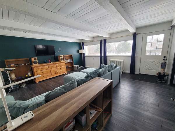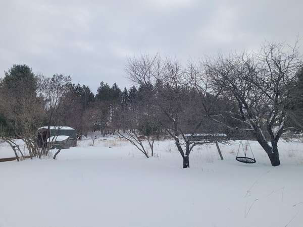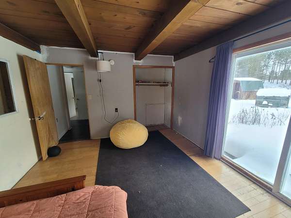 This home sits on a beautiful 4.82 acres with woods at the back and fruit trees up front. Of the three bedrooms, one has a sliding door out to a deck. The wood ceilings through out have the beams exposed, a unique feature. It has an open concept with the kitchen and dining area flowing into the large living room for a great room feel. The large windows in the Livingroom face the southwest, which gives plenty of sunshine throughout the day.