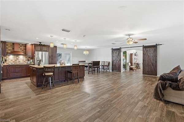 Spacious 5-bedroom plus den home with over 2,700 sq ft of living space situated on a 5.15-acre lot in a quiet area of Golden Gate Estates, offering no HOA fees or restrictions. Concrete block construction with a large open kitchen and living area, granite countertops, gas cooktop, oversized breakfast bar, dining space, family room fireplace, large closets, and a whole-house osmosis system. Enjoy indoor/outdoor living with French doors leading to a screened lanai, pool and spa, east exposure, front screened lanai, large screened pool area, fenced backyard, and long private driveway. Exceptional storage and workspace, detached 4-car garage/workshop, 3 carport spaces, and additional room for vehicles, boats, RVs, equipment, or future expansion. Property also includes a chicken coop/house. Conveniently located just 5 minutes from Everglades Mart and 7 Mart, with schools, shopping, dining, and daily conveniences nearby. Brand-new EMS/Fire Station just down the road. A great opportunity for those seeking space, privacy, and flexibility while still close to Naples amenities. Excellent investment potential.