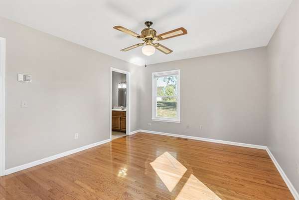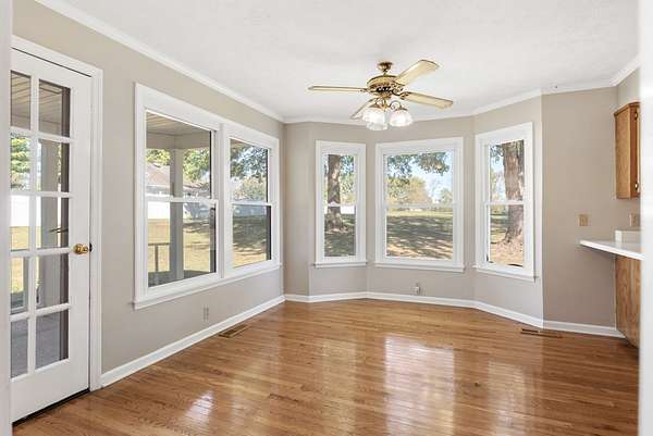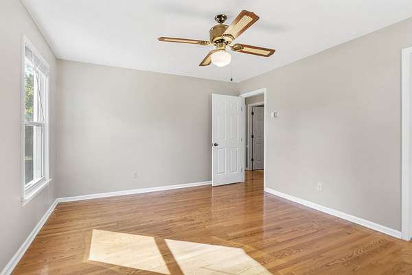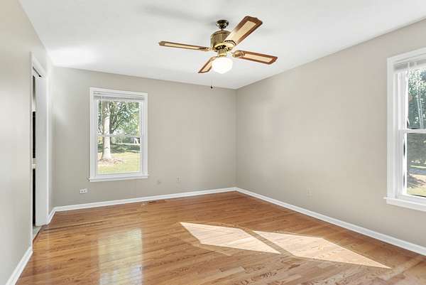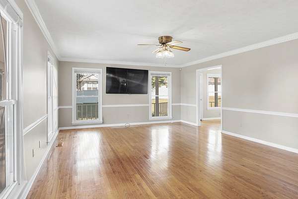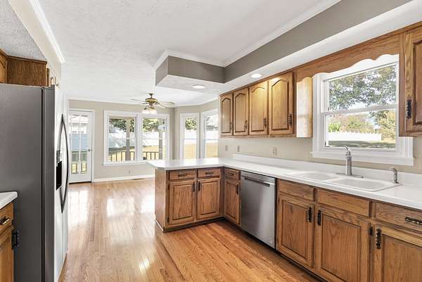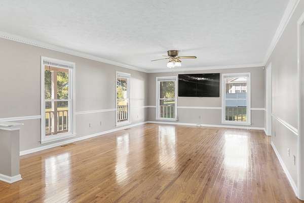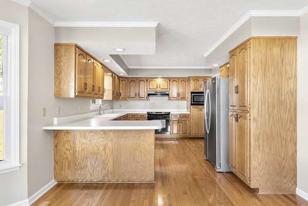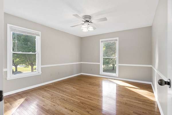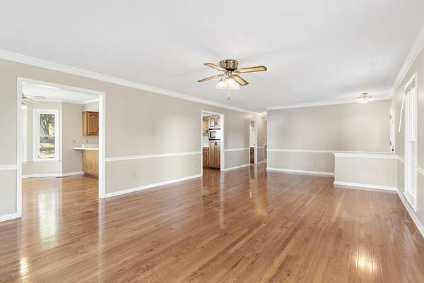 The house has a balanced, practical design with a wraparound porch and a comfortable flow between rooms. Inside, hardwood floors run throughout the main living areas, and large windows let in plenty of natural light. The kitchen includes generous cabinet space, functional countertops, and a layout that connects easily to the rest of the home.
