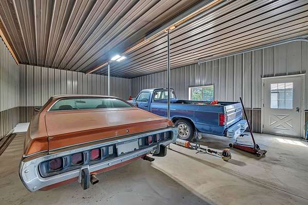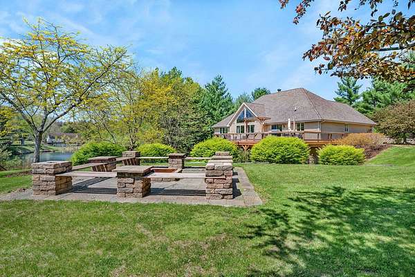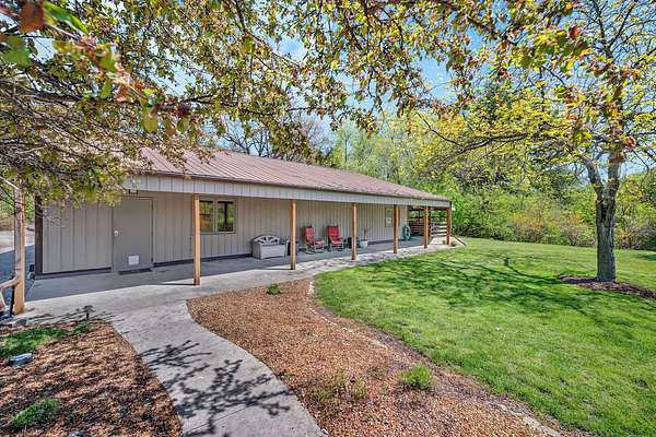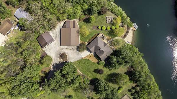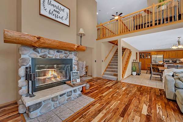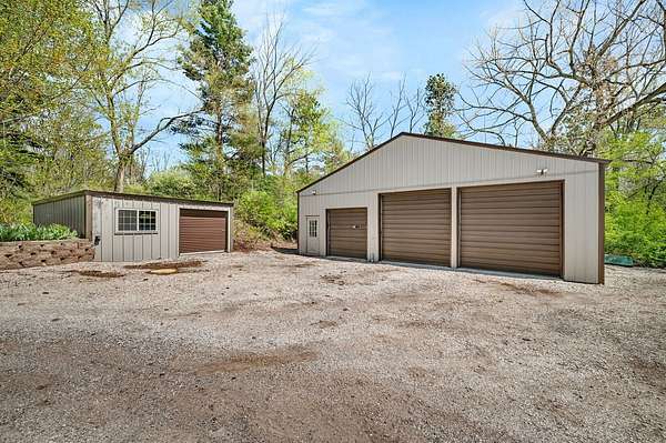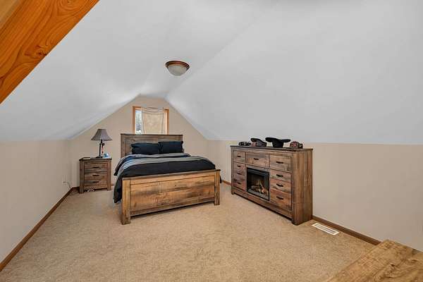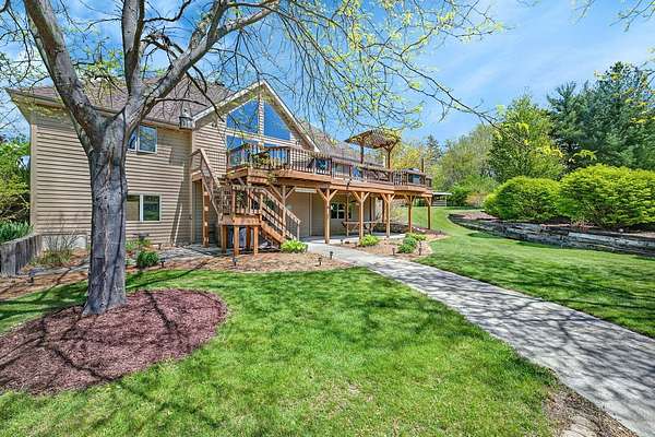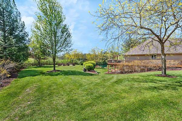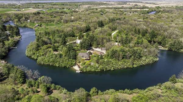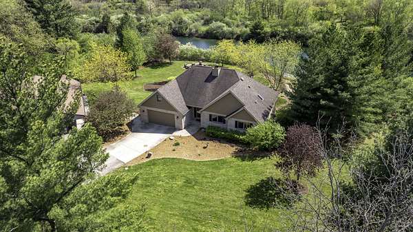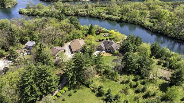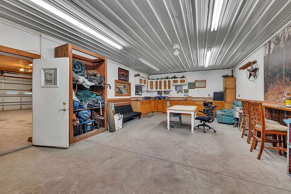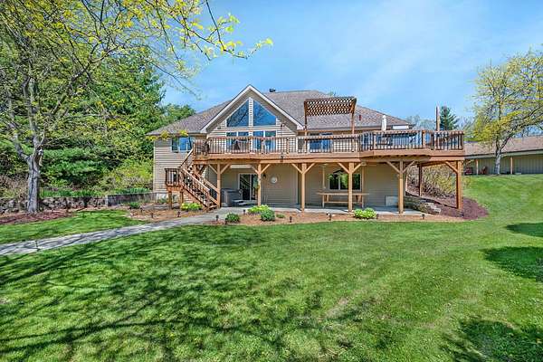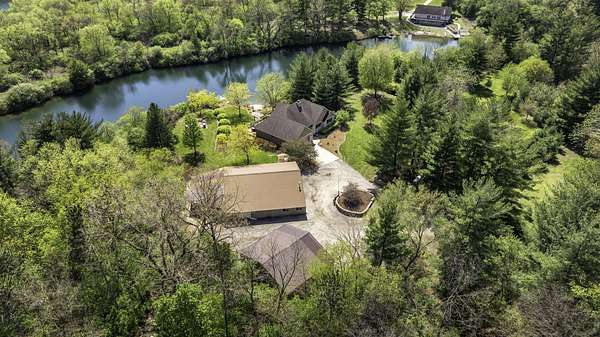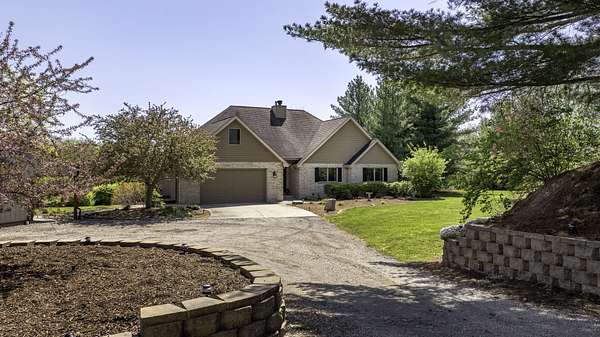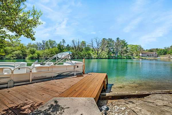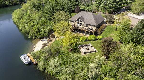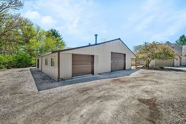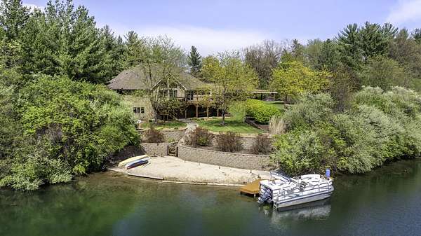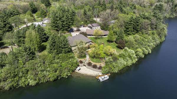 Discover the perfect blend of privacy, natural beauty, and exceptional living space in this 4bedroom, 3.5 bath story and a half home set on 8.22 breathtaking acres on picturesque Deer Lake. A treelined driveway welcomes you and immediately sets the tone for the serene setting that surrounds the property. Step into the foyer and feel the warmth of home. The oversized family room is a true showstopper-vaulted ceilings, a woodburning fireplace, and floor to ceiling windows frame stunning lake views that can be enjoyed year round. The spacious dining area flows seamlessly into a well appointed kitchen featuring custom cabinetry, granite countertops, stainless steel appliances, a large pantry, and a center island-ideal for entertaining or everyday living. A convenient main floor laundry room adds to the ease of the layout. The main floor primary suite includes a full attached bath and walk in closet. Two additional generously sized bedrooms and a guest bath complete the main level. Upstairs, an expansive 500+ sq ft loft offers endless possibilities-office, den, playroom, or creative studio. The finished walkout basement is designed for fun and relaxation. Enjoy the bar, with wine refrigerator, recreation room, theatre room with projector, a bedroom, full bath, and ample storage. Radiant heat has been installed throughout the main and lower levels-just awaiting connection to a dedicated water heater. 2 car attached garage adds space for your vehicles and more storage. Step outside to the covered patio or head up to the impressive 50' x 15' composite deck overlooking the lake. Outdoors, the magic continues. Gather around the stone firepit with built in seating, or head down to your private beach with a wide shoreline and boat dock. Deer Lake is a peaceful, no wake, approx. 70acre lake with depths up to 35 feet-perfect for swimming, fishing, canoeing, or enjoying a quiet pontoon ride. The land is enriched with peach, apple, and cherry trees, blueberry bushes, and an oversized vegetable garden. The entire property is irrigated and includes a whole house Generac generator for peace of mind. For hobbyists, collectors, or those needing serious storage, the outbuildings are unmatched: Two steel pole barns with heat, A/C, and concrete floors includes a storage shop with woodburning furnace and a lean-to cold storage building with two rollup doors and a half bath as well as a 13' x 10' shed. This is the dream home and setting you've been waiting for. Don't let this rare opportunity pass you by-schedule your private viewing today.