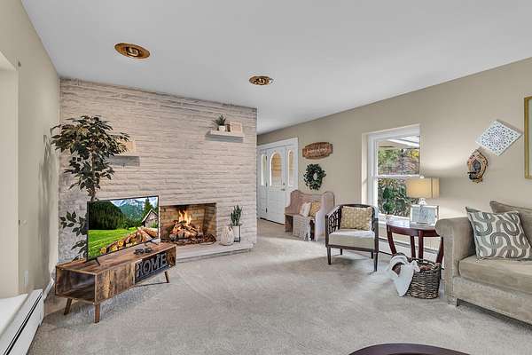 Est $1,936/moWelcome home to this beautifully updated 3-bedroom, 2-bath ranch nestled on 2 peaceful acres surrounded by towering pines and hardwoods. Enjoy cozy evenings by one of the home's three fireplaces-located in the living room, office/3rd bedroom, and basement. The large picture window brings in abundant natural light, and the outdoor patio is ideal for morning coffee or weekend gatherings. With its charming limestone exterior and thoughtful updates-including a newer boiler, new flooring, fresh paint, updated bath, and new gutters-this home perfectly blends modern comfort with timeless appeal.