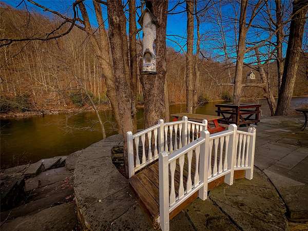 This house and property are perfect for entertaining friends and family with an open kitchen, living and dining areas and a sunroom overlooking the river. An intimate area that is still open but comfortable is nestled in the living area right in front of the bluestone fireplace. A master suite is separate and upstairs with a balcony that gives a birds eye view over the river, back deck and patio. The three bedrooms and full bath on the first floor ensure everyone has enough room and privacy and the full basement with additional wood burning fireplace is a great space for entertaining or a workshop.