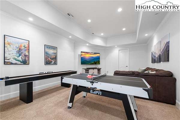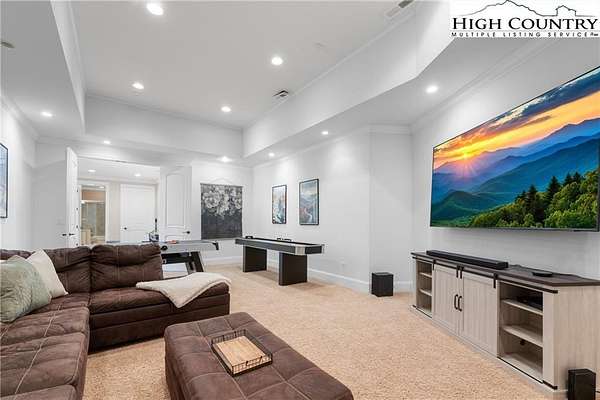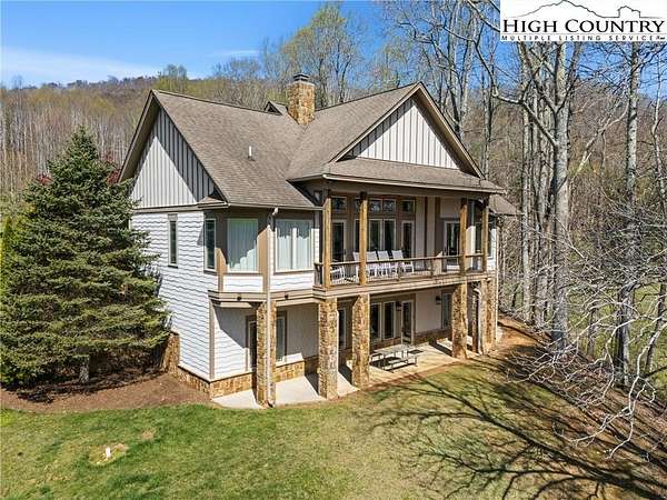 Welcome to this stunning mountain retreat in Linville Falls Estates, set on three beautifully landscaped lots, just across from the popular Linville Falls Winery. This spacious and fully furnished home offers over 4,200 square feet of living space with two distinct living areas, four generously sized bedrooms, four full bathrooms, a massive game room, and an oversized two-car garage for full-time living, second home enjoyment, or vacation rental income. Step into the main level's open-concept floor plan with HIGH ceilings, a floor-to-ceiling stone fireplace, and an inviting living room that flows seamlessly into the chef's kitchen. The kitchen features granite countertops, stainless steel appliances, a breakfast bar, and a sunny dining nook surrounded by windows. Off the kitchen, relax or dine on the large screened-in porch with its own stone fireplace, for cool summer nights. A formal dining room and long covered rocking chair deck make entertaining easy and comfortable. The luxurious primary suite offers privacy and comfort with deck access, two walk-in closets, and a spa-like en-suite bath with double vanities, a soaking tub, and a tiled walk-in shower. A second full bath and laundry room with storage complete the main level. Upstairs, a spacious bedroom over the garage easily accommodates multiple beds and recreational space. Downstairs, you'll find a second living area with high ceilings, two more large bedrooms, two full baths, and a huge game room with ping pong, shuffleboard, and a media area. There is room for everyone to spread out in this home! The park-like setting includes a firepit, lawn, and ample parking on the large concrete driveway. Short-term rentals (5+ days) are allowed, making this an excellent investment or income-producing property. Just 3 miles to the famed Linville Falls, this newer subdivision in Newland, NC offers large lots, quality homes, and unbeatable value in Avery County.