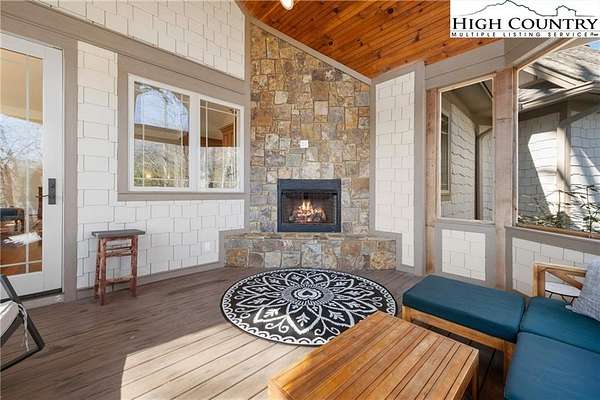 The main level features an open floor plan with high ceilings, a floor-to-ceiling stone fireplace, and a living area that flows directly into the kitchen. Granite countertops, stainless appliances, a breakfast bar, and a window-lined dining nook keep the space functional and bright. Just off the kitchen, the screened in porch—with its own stone fireplace—and the covered deck provide easy outdoor living. A separate dining room adds additional space for hosting.