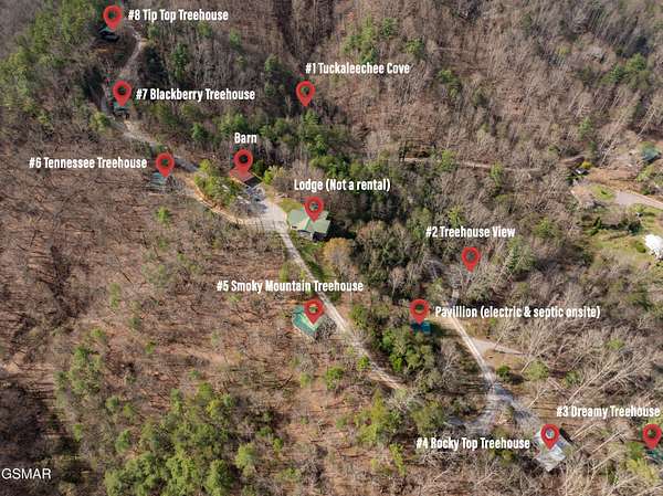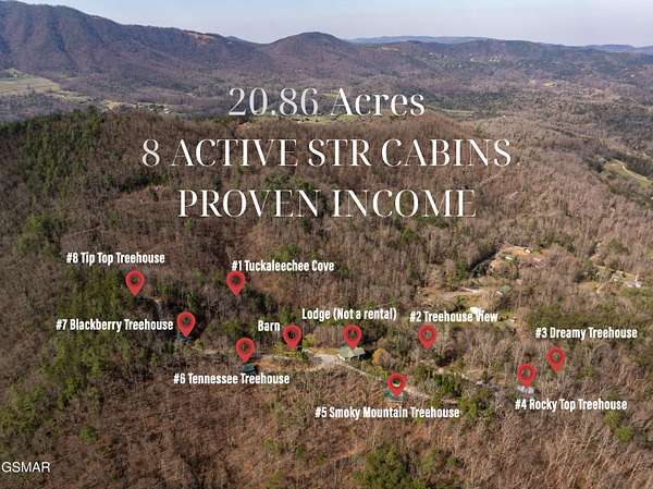 Located in the heart of the Great Smoky Mountains in Townsend, fondly known as the ''Peaceful Side of the Smokies'' this exceptional 20.86 acre resort presents a rare opportunity to own a proven, high performing short term rental portfolio in one of East Tennessee's most desirable destinations. Perched at approximately 1,500 feet in elevation, the property offers sweeping, panoramic mountain views and an unmatched sense of privacy and tranquility. Thoughtfully developed and meticulously maintained, the resort has quickly established itself as a top-tier income producing asset with a strong and consistent financial track record. The numbers speak for themselves. Generating over $270,000 in its inaugural year (2022), increasing to $287,000 the following year, and reaching an impressive $363,000 in 2024, with $317,000 recorded in 2025. This growth underscores both the strength of the location and the property's operational success. The resort features a total of 8 fully furnished, turnkey cabins, including 5 traditional cabins and 3 treehouse style cabins. Each unit is designed to deliver a premium guest experience, complete with hot tubs, arcade games and fire pits. Guests are immersed in nature with private hiking trails that wind throughout the property, creating a true mountain retreat experience while still being just minutes from top area attractions. Located only 2 minutes from Townsend's popular bike greenway and river tubing access, and a short drive to Cades Cove, Gatlinburg, Pigeon Forge, and Sevierville, the location offers the perfect balance of seclusion and accessibility. Originally undeveloped for nearly 15 years, the current owner has transformed this property into a thriving STR business with no restrictions, offering flexibility for self-management or the option to partner with a professional management company. For investors looking to value add: significant upside potential! The planned 9th unit, ''360 Lodge,'' has huge potential for STR revenue once completed. An existing pavilion (with separate septic and well) offers conversion potential into a 1-2 bedroom rental. A small barn presents a unique opportunity for an event venue. With multiple avenues for expansion and revenue growth, this property is not just a turnkey investment, it's a scalable business with substantial future upside. This is a rare chance to acquire a Smoky Mountain resort combining natural beauty, location, and proven income performance. An investment opportunity that truly stands apart!