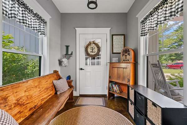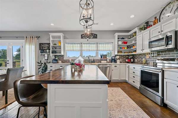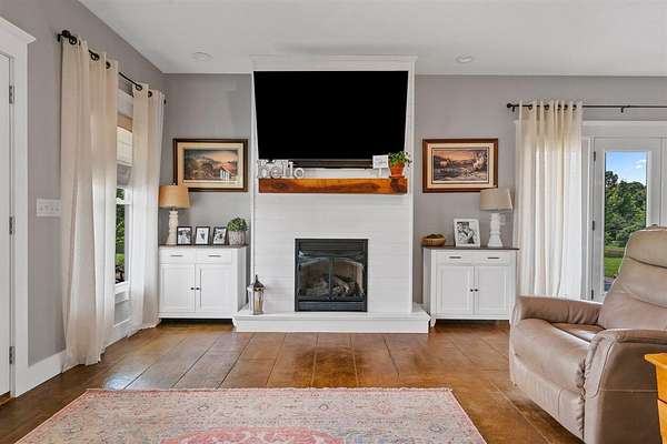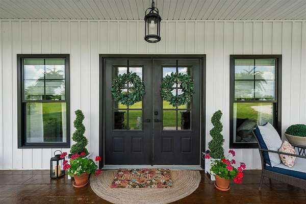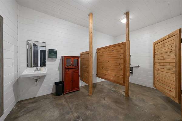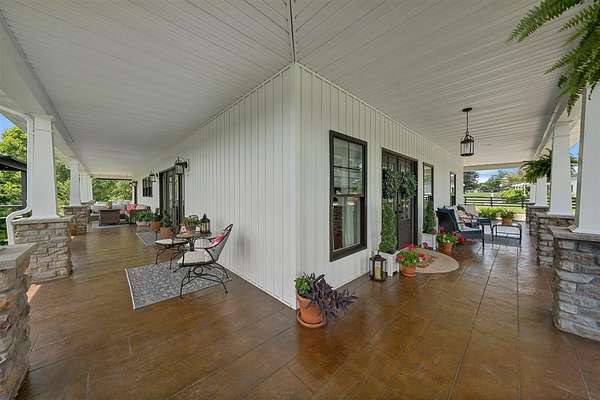 - Barn, Concrete Walks, Court Yard, Covered Front Porch, Covered Patio, Exterior Lights, Landscaping, Mature Trees, Outdoor Lighting, Stamped Concrete Walks, Storage Building, Trees