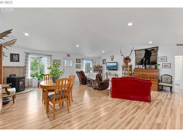 Tucked away at the end of a quiet dead-end road, this 21.32-acre property offers the perfect blend of privacy, space, and stunning natural beauty. The 3-bedroom, 2-bath home features 1,652 sq ft of comfortable living space with tile and wood flooring throughout. A brand new roof and a recently installed pellet stove ensure peace of mind and cozy winters. The home includes a dedicated laundry room and a spacious 768 sq ft attached garage, perfect for storage or hobbies. Outside, enjoy panoramic views, direct access to public BLM land, and a private motocross track ready to be revived for adventure and fun. With low property taxes and endless potential, this property is ideal for outdoor lovers, hobby farmers, or anyone seeking a peaceful rural retreat with room to roam.