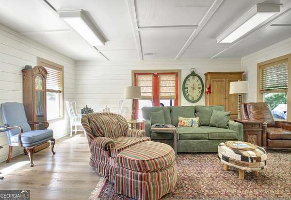 Welcome to your own private retreat in beautiful Brooks, GA-just a short drive to the charming shops and dining of Senoia and Peachtree City. Built in 2023, this rustic-style home sits on over 7 wooded acres, offering a perfect blend of modern comfort and country serenity. This 1 bedroom (with potential for a 2nd bedroom on the main level), 1.5 bath home features classic board and batten siding and warm cypress walls throughout. Step inside to a light-filled family room with large windows framing peaceful views of the surrounding hardwoods. The kitchen includes a cozy breakfast area, and a convenient half bath completes the main level. One of the highlights of the home is the sunroom, a tranquil space overlooking the creek that winds through the property-complete with its own charming bridge. Upstairs, you'll find the bedroom suite and full bathroom with dual sinks, a soaking tub, and a separate shower. Outdoors, enjoy mature blueberry bushes, pear trees, and a fenced-in garden that's already been planted and thriving. Several outbuildings offer space for hobbies, storage, or expansion. A covered carport adds to the convenience. This well-maintained property offers an ideal escape for those seeking peaceful living with modern amenities in a natural setting. Don't miss the opportunity to own a slice of country paradise!
