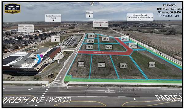 The property is positioned directly across from the Johnstown Police Department, Town Hall, and High Plains Library, and adjacent to the Johnstown Community YMCA, which serves over 6,000 members. All pads include access to raw water, making the site well-suited for a wide range of commercial users.