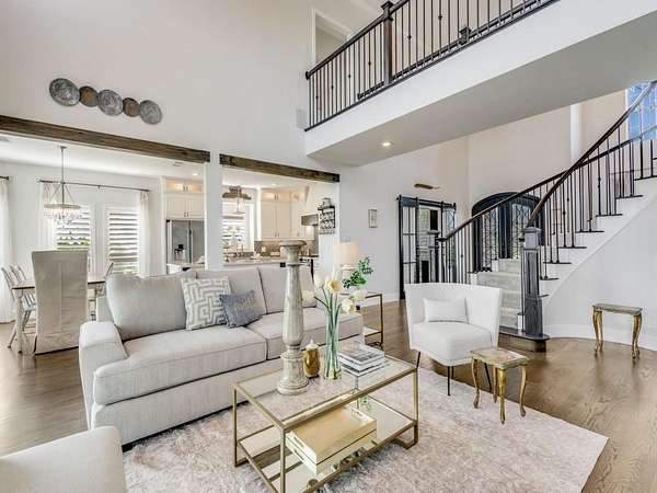 The home offers over 3,000 sq. ft. of living space with a grand entry featuring high ceilings, chandeliers, a curved staircase, and abundant natural light. The kitchen includes quartzite countertops, pot filler, and views of the backyard. The family room features a wood burning fireplace with cedar mantle and retractable glass doors opening to the pool area.