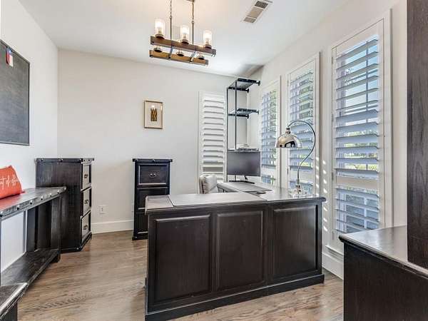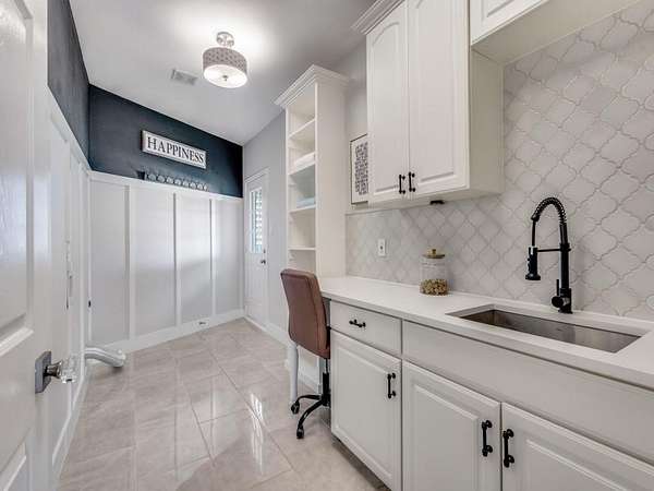 Interior features include built ins, custom steel exterior doors, plantation shutters, surround sound, and a utility room with quartz counters, sink, built-ins, and space for a desk or pet area.