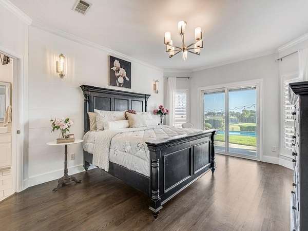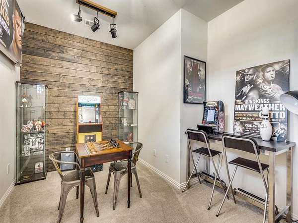 The primary suite is located on the main level with direct backyard access and an en-suite bath featuring Bluetooth speakers, mood lighting, and TV hookup. A secondary bedroom on the main level provides flexible use as a guest room, office, or gym. Additional spaces include a game room and a media room with platform seating, bay window, and media storage.