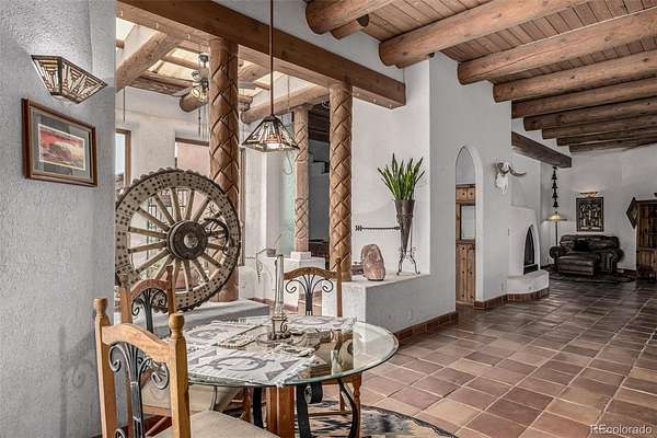 Step inside to find hand-carved wood doors, imported Mexican Terrazzo tiles, authentic vigas beams, stained glass windows, and kiva fireplaces--all woven into three bedrooms and two elegant baths. A detached six-car garage and workshop with oversized aprons includes an additional half bath, perfect for ranch hands.