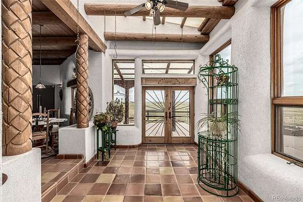 Welcome to a one-of-a-kind Adobe Santa Fe Hacienda offering panoramic views of Colorado's Front Range and the soul of the Wild West. Crafted with sustainable straw bale steel post and beam construction with an enclosed front courtyard. this residence pairs environmental consciousness with timeless beauty.