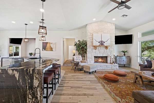 Welcome to 4607 R O Dr, Spicewood, TX 78669 - a rare, income-producing Hill Country estate on 10 unrestricted acres that blends luxury, scale, and flexibility. Built in 2001, this sprawling compound features 6,137 sq ft across three distinct structures, combining 7 bedrooms and 5.5 bathrooms. Currently operated as a high-end short-term rental and event venue, the property generates proven returns while also functioning seamlessly as a private family compound or legacy retreat. Each building is designed for independent living, yet the ensemble creates a unified experience surrounded by panoramic views, resort-style outdoor amenities, multiple gathering spaces, and utility outbuildings. With no HOA, no deed restrictions, gated access, and proximity to Highway 71 and the Austin metro, this offering presents an unmatched opportunity for commercial, hospitality, or boutique retreat investors.