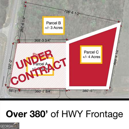 Est $13,911/moSEWER IS AVAILABLE . PARCEL C is located just on the intersection of Hwy 78 and Hwy 53, which is on the western border of Oconee County. Hwy78 is a four laned hwy which connects Athens to Monroe and on to Atlanta. Hwy 53 provides access to SR 316 and Watkinsville. The property is roughly 8.5 miles from Athens, and 45 miles from i-285. this is right next to the new DR Horton 445 Acre Commercial and residential Development. There are only 2 parcels left. check the other Gamls: 10403631