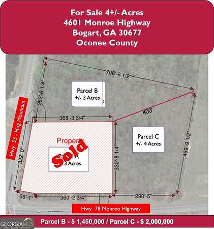 Est $13,911/moSEWER IS AVAILABLE . PARCEL C is located just on the intersection of Hwy 78 and Hwy 53, which is on the western border of Oconee County. Hwy78 is a four laned hwy which connects Athens to Monroe and on to Atlanta. Hwy 53 provides access to SR 316 and Watkinsville. The property is roughly 8.5 miles from Athens, and 45 miles from i-285. this is right next to the new DR Horton 445 Acre Commercial and residential Development. There are only 2 parcels left. check the other Gamls: 10403631