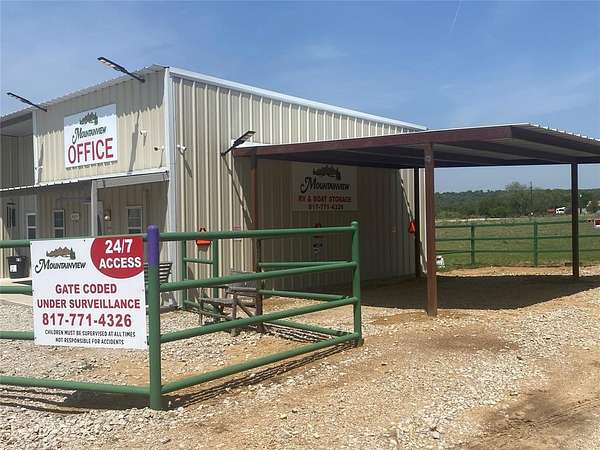 Head West on Hwy 180 from historic downtown Mineral Wells 4 miles. Turn Right on Halsell Rd. you will see sign on the Left of Mountainview RV & Boat Storage. Entrance gate is secured and has security footage for protection. The next gate on the Left is the entrance to Warehouse and Ranchette.
