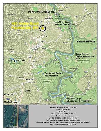 From Fayetteville: 2.8 Miles (approximately 5 minutes) From the US-19 and Court Street intersection near Tudor's at main town Fayetteville, travel US 19 south toward Oak Hill for 2.7 miles; turn right onto Hinkle Road; travel about 185 feet; the entrance of the road leading to the property is on the right.