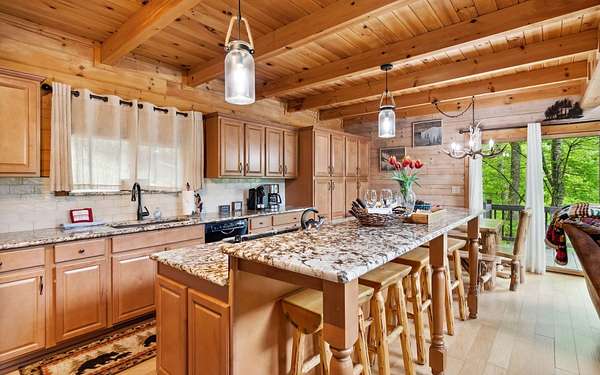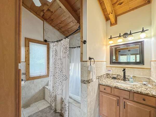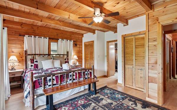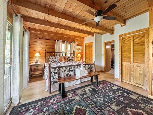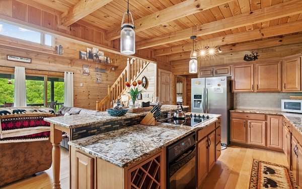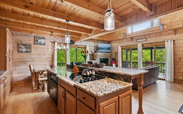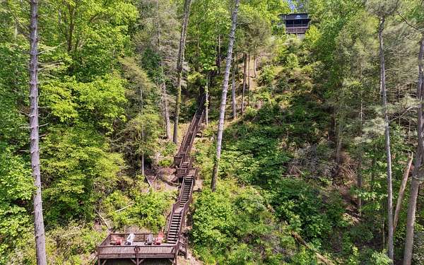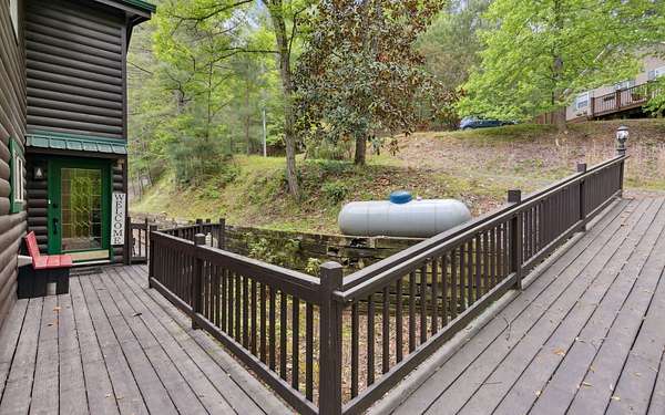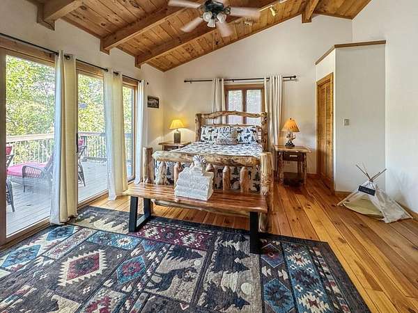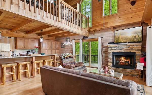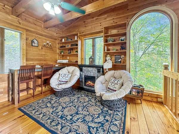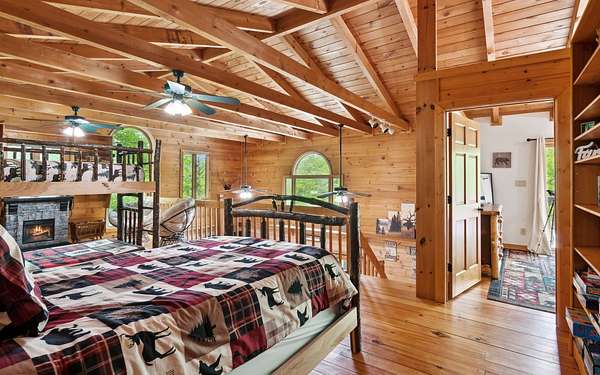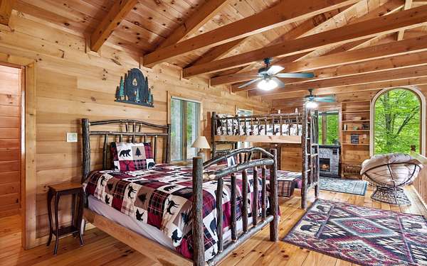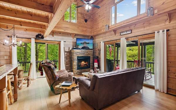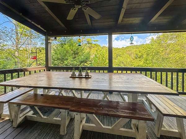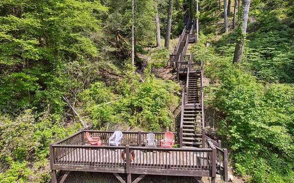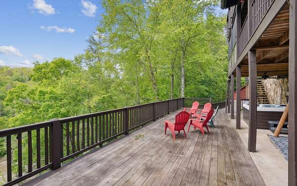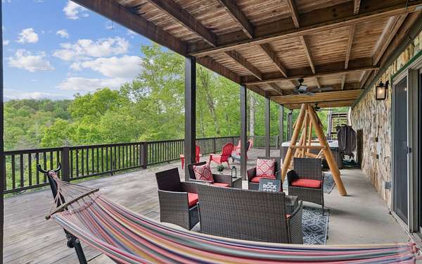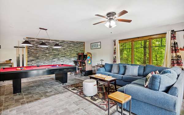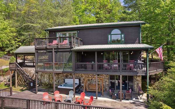 Kayak and Tube to your relaxing riverfront cabin on the loud Coosawattee River from the park upriver or sit on one of the many porches, just immersed in nature. The outdoor living here is designed for gathering and making memories (Hot tub, Fire pit so many extras, read on!) This turnkey vacation home has it all. Main level parking, kitchen, great room, primary bedroom, not to mention extensive open and screened porches. Two upper bedrooms (one is a bunk loft) with a Jack and Jill bathroom, The terrace level is AMAZING with a custom bunk nook, fabulous rec room (pool & poker tables & arcades), porches and outdoor living area for the total getaway feeling. Resort amenities include a nearby (3 min.) Recreation Center w/indoor heated pool, fitness center, arcade room, tennis, pickleball, 18 holes of mini golf, other outdoor pools and parks, kayaking and tubing in the subdivision, and so much!