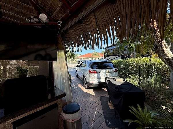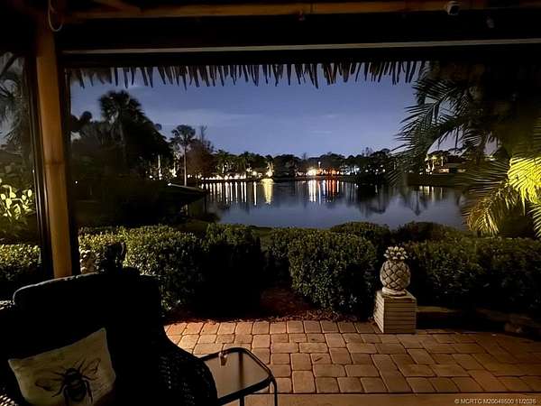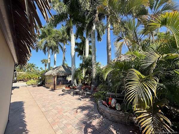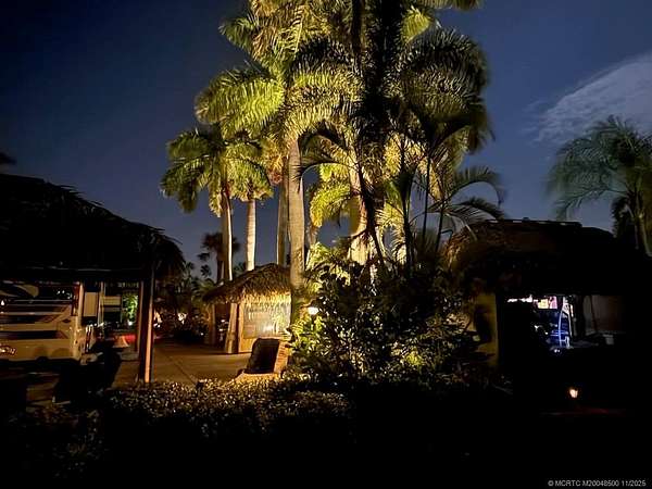 STUNNING LAKE VIEW! Get ready to fall in love with this spectacular north-facing lot, perfectly located just a short walk from the clubhouse and main pool. Offering one of the best views of the lake and its lighted fountains, this 3,521 sq. ft. property is a rare gem. With 70 feet of frontage, there's plenty of space for both golf cart and car parking. The landscaping is simply breathtaking-mature plants in raised paver beds provide both beauty and privacy, while majestic up-lit Royal Palms and extensive landscape lighting create a magical ambiance, day or night. The large hurricane-rated, all-weather tiki features a granite-topped bar. The large hurricane-rated, all-weather tiki features a granite-topped bar, making it the ultimate spot for entertaining and a second tiki to maximize the lakefront experience. This lot is fully furnished with top-of-the-line pieces, including a dining table and chairs, a fire pit table, and lounger. Every detail has been thoughtfully considered.