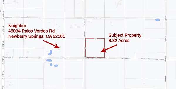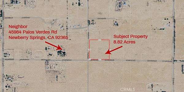 Claim your own 8.82-acre corner lot (APN: 0532-121-34-0000) in the welcoming high-desert community of Newberry Springs. Perfectly situated at the intersection of Caspian Road and Palos Verdes Road, this versatile property offers the space and freedom to create your vision--whether it's building a custom home, starting a farm, or investing for the future.