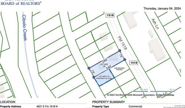 Est $1,695/moAmazing Investment Opportunity now available to build on Commercial Lot!! Located in strategic & thriving economy area in Selma (highly trafficked road). Electric and Water Meter on-site. Completely fenced property. This sale includes FOUR LOTS sized .76 acre - *Adjacent Front Left Lot with Mobile Home - AS-IS- 4605 FM 1518. All Lots are ZONED C- *Information deemed reliable but not guaranteed. *Buyer to independently verify Measurements, Taxes & Zoning Restrictions with the City of Selma.