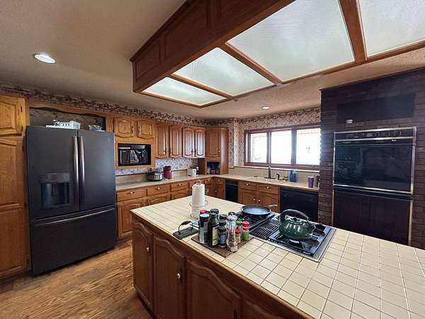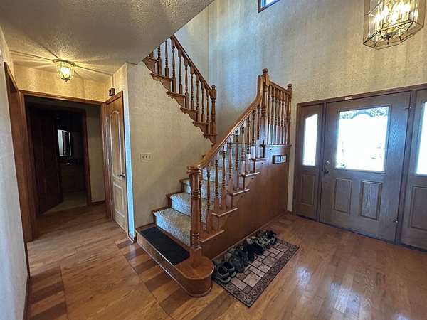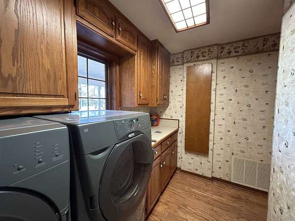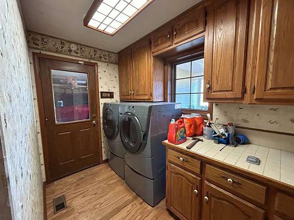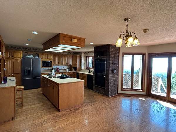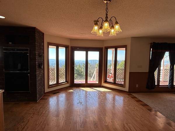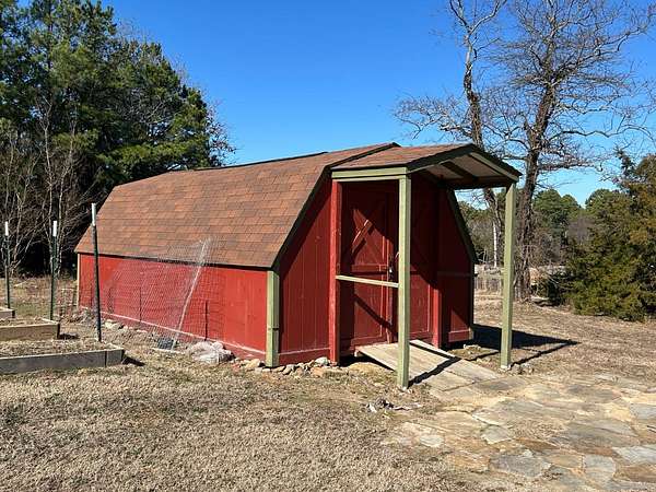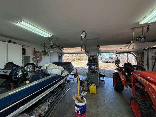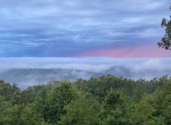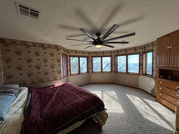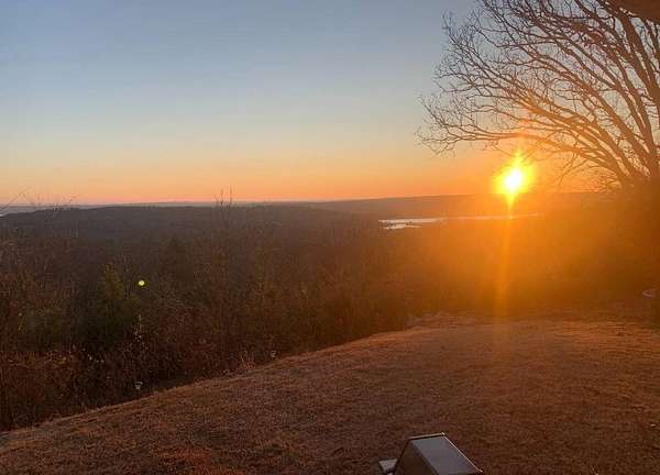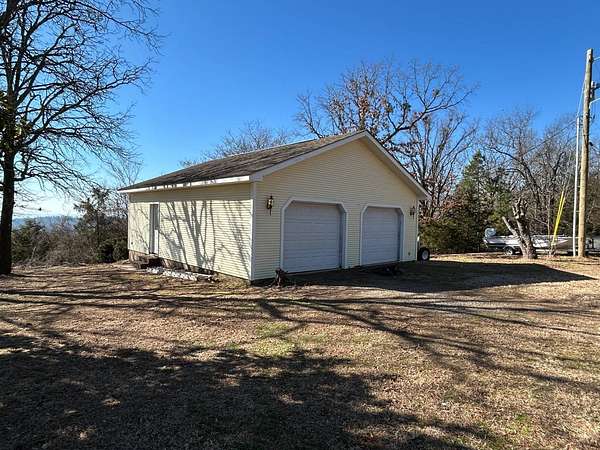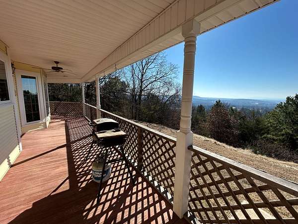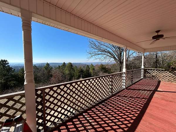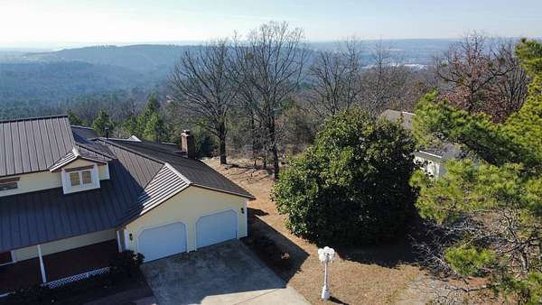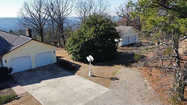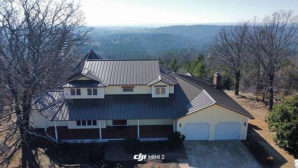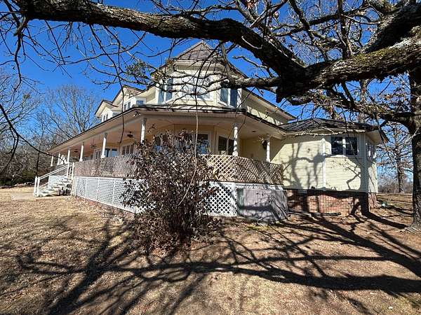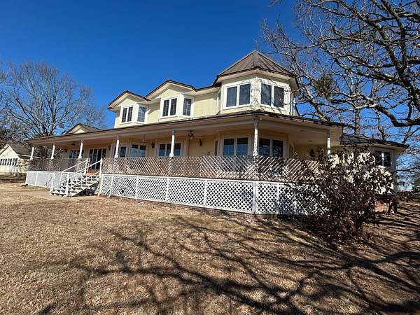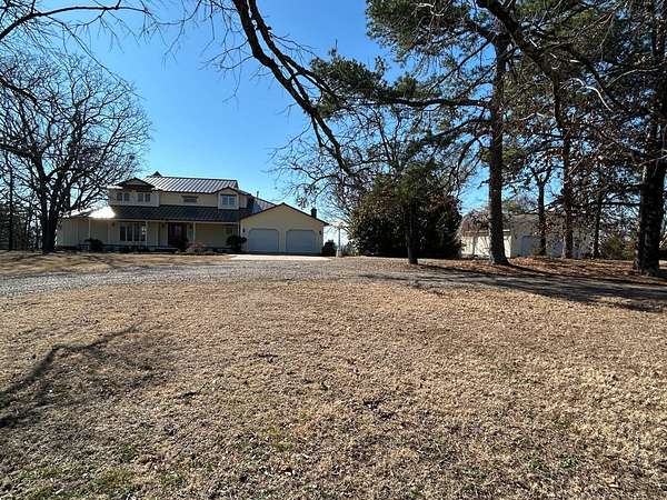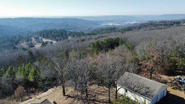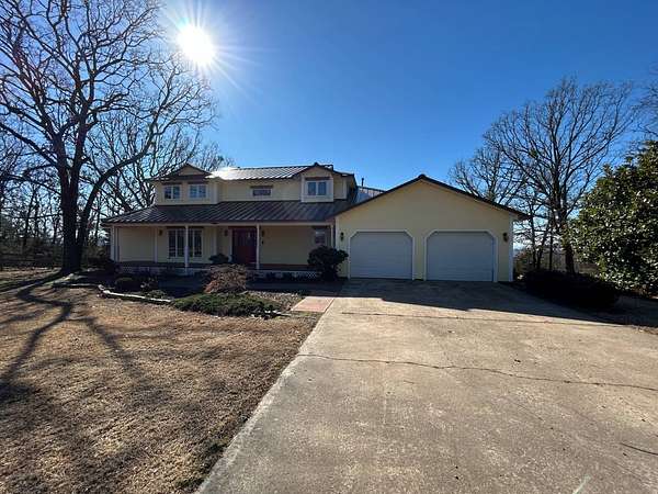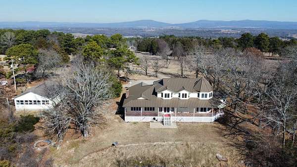 Breathtaking views from this 3,041 sq ft custom-built home on 10.70+- acres located just east of Ozark, AR. Panoramic views to the north and south, including the Arkansas River, Ozark River Bridge, Mt. Magazine, Poteau Mountain, and more. This property features manicured open land and wooded areas with mature and newly planted trees, a circle drive, city water plus a deep well for watering, fiber internet, and an ideal location close to Fort Smith and approximately one hour from Fayetteville. Improvements include a 32x28 finished shop with cabinets, extensive storage, and two overhead doors with openers, plus a 12x20 storage building. The home showcases a large open downstairs floor plan flowing from the kitchen through the dining area into the living room, highlighted by abundant south-facing crank-out windows providing incredible views and natural light. The living room includes a Country Flame wood-burning stove ducted throughout the home with thermostat control and a convenient wood box accessible from both the house and garage, the fireplace is currently used as a gas log fireplace. The kitchen offers ample storage, a large island with gas cooktop, double electric ovens, dishwasher, and a large window. Also on the main level is a versatile large room with a full bath, safe room, built-in lighted cabinets, and numerous windows. Hand-finished oak trim and woodworking are featured throughout along with covered front and back porches, . Upstairs includes three bedrooms and two baths, including a spacious primary suite with walk-in closet and ensuite bath with whirlpool tub, shower, and double vanities; all bedrooms feature south-facing windows and custom oak built-ins. Additional highlights include a large attached two-car garage with exterior access, two overhead doors with remotes, separate water heaters for each level, two heating units, gas heat with electric air, a new standing seam metal roof (2021), and a replaced downstairs HVAC unit (2021). Built in 1985, this incredibly well-built and well-insulated home offers quality, comfort, and unmatched views.