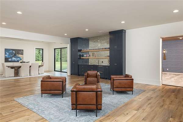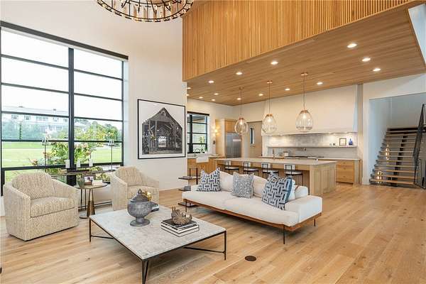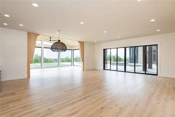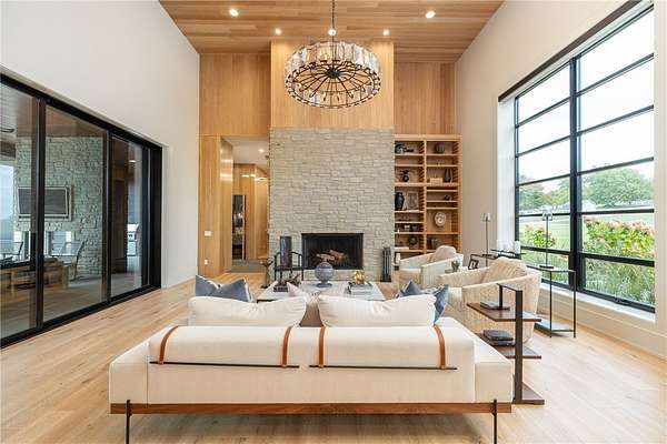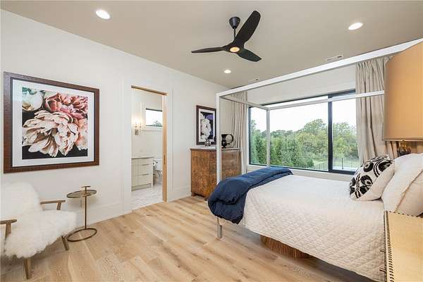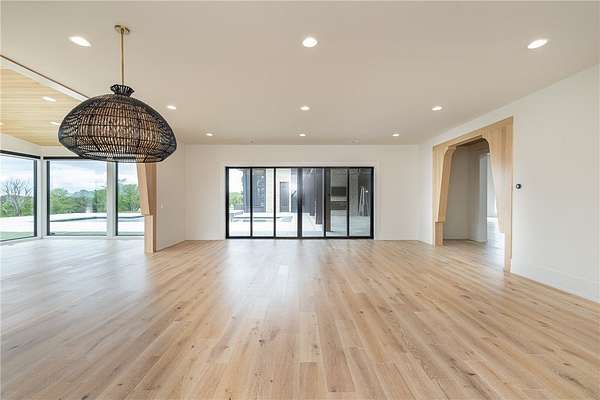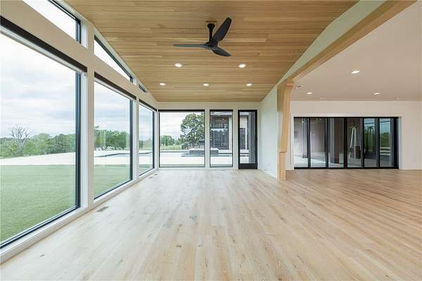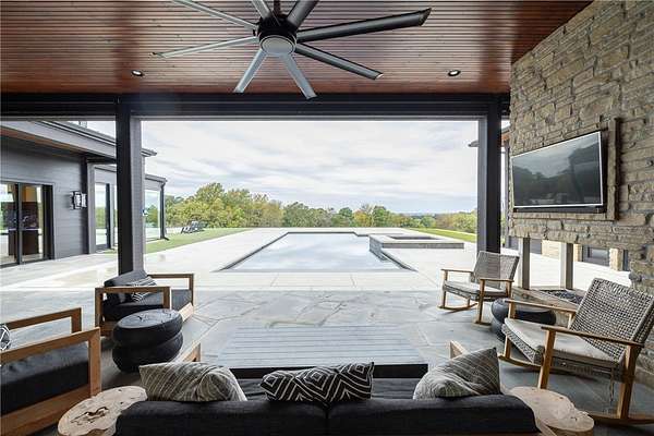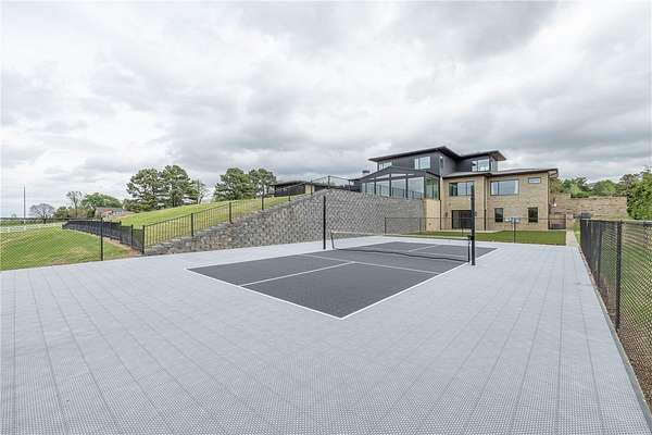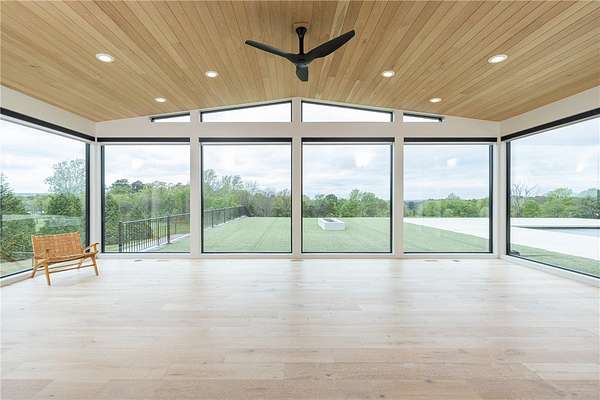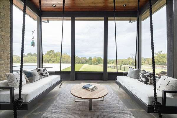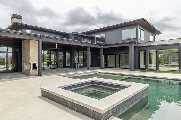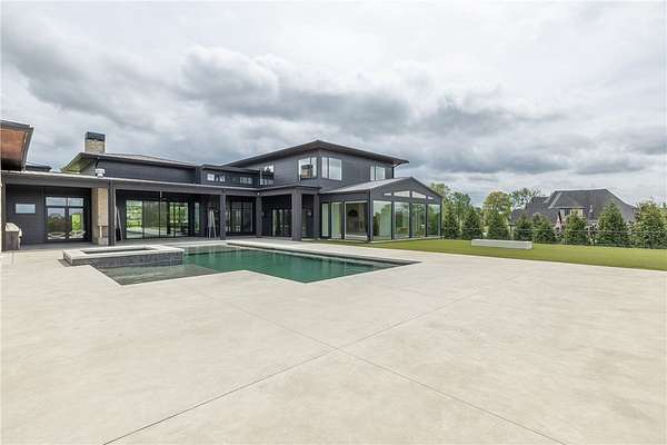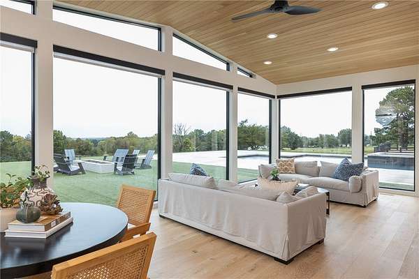 This stunning custom-built estate in East Fayetteville offers a rare chance to own a like-new home without the wait. Meticulously maintained & move-in ready, it sits on 5 serene acres with a private pond. The 13,000+ sq ft residence features 5 bedrooms, 5 full baths, and 1 half bath. Exceptional craftsmanship is evident in white oak floors, marble finishes, soaring ceilings, & abundant natural light. The chef's kitchen includes a Lacanche range, triple dishwashers, & premium appliances, opening to a grand living area with retractable glass doors for seamless indoor-outdoor living. Highlights include a two-story office, luxurious primary suite with screened porch & yoga room, plus a den, solarium, theater, & basement bar. Outdoor features include a beach-entry pool, fire pit, pickleball court, & heated patios. A 6-car garage offers an EV charger, car lift, & wash bay. Solar power completes this private luxury. Recently sold & never occupied due to an unexpected relocation.