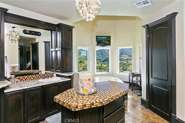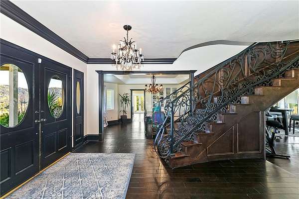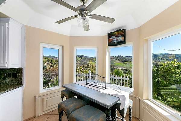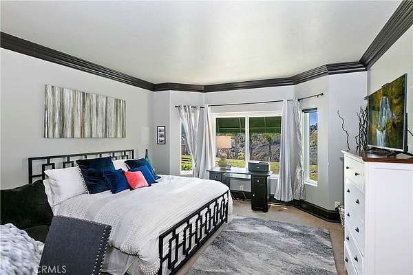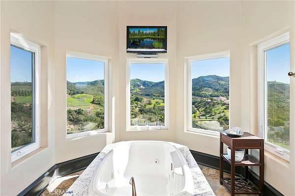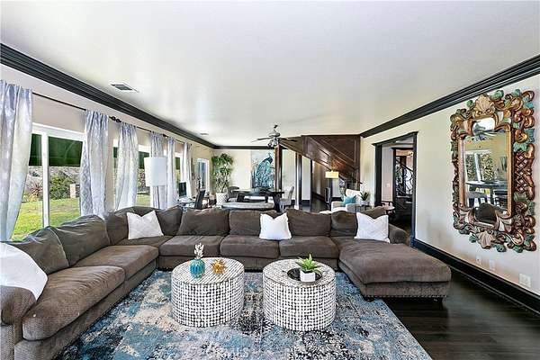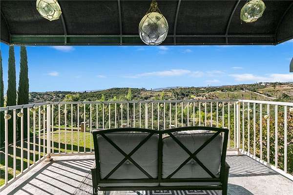 When entering the home through the double front doors, you'll immediately appreciate it's Grand Scale, with the beautiful scrolling iron banisters, coffered ceilings, exquisite woodwork, hardwood flooring, and open floorplan. Enjoy a cozy evening by the fire, reading a book, or chatting with friends in the lounge/den with beautifully crafted wood, full wall, built-in wine racks and cabinets, granite counters, and wainscot throughout, this room is a must see! Looking to entertain, then you'll enjoy the huge family room, formal dinning room and beautiful kitchen with eating area with never ending views. Need room for guests, no problem, down the hallway you'll find a bedroom with walk-in closet, full bathroom, and separate powder room off of the family room. Gigantic laundry room with plenty of storage. Upstairs you will be stunned by the craftsmanship in this gorgeous home. The master bedroom has its own retreat for reading or tv time and the master bedroom has a private 3 sided fireplace. Who needs a spa day when you have this master bathroom with jetted tub facing out the windows with never-ending views. There are 2 more bedrooms upstairs with stunning full bathrooms and cathedral ceilings, separate bonus area with balcony, and another bonus room with built-in desks and storage for play room, home office or a plethora of other uses. The backyard of this stunner consists of a pool and spa, bbq and firepit. Sit by the fire and enjoy the stars with your unobstructed view. Looking to have some animals, there is plenty of room for barn or garden, or vines. Neighboring 5 acre parcel also available. Call Jenny for private showing at 951-203-2385
