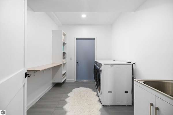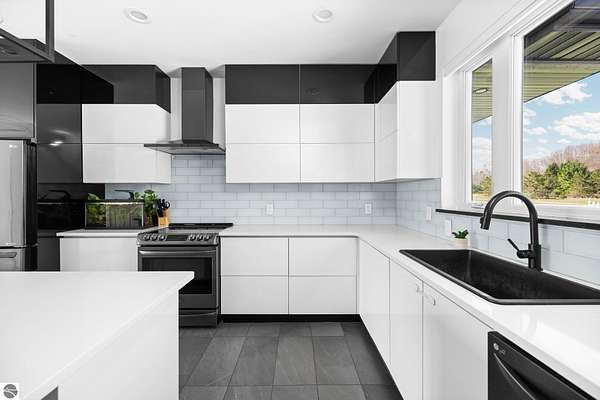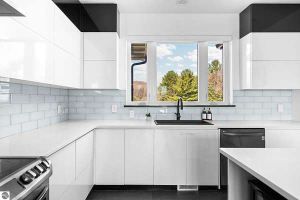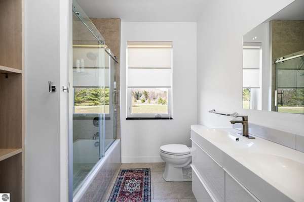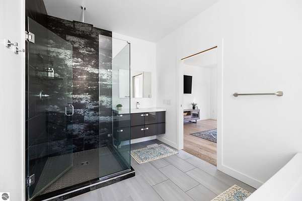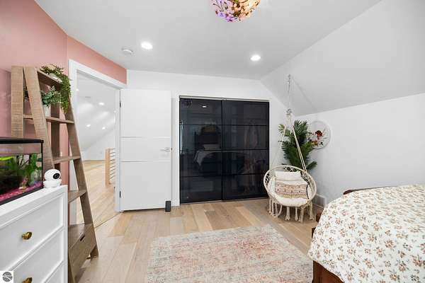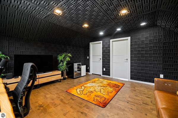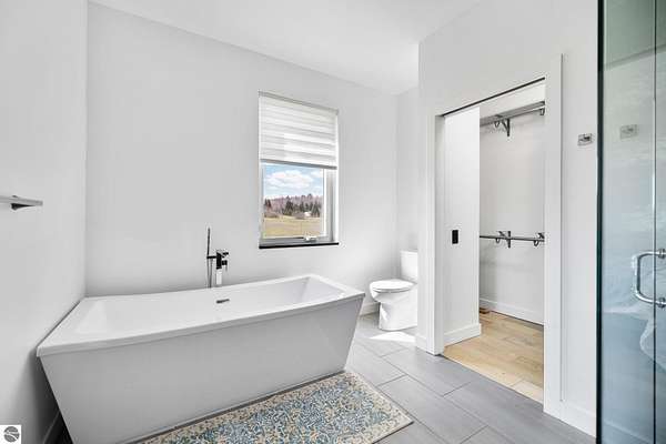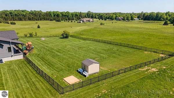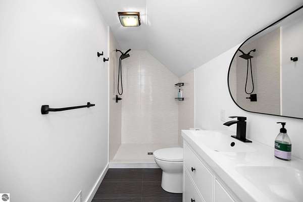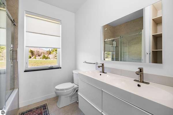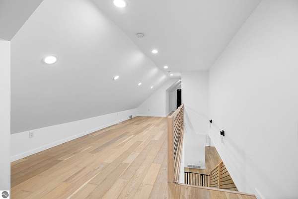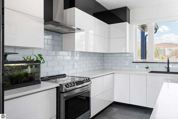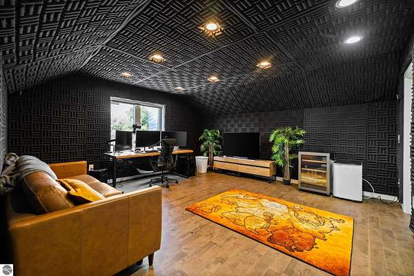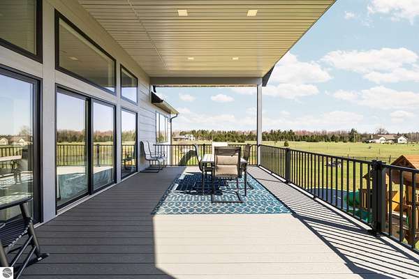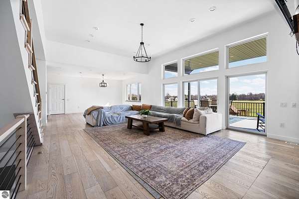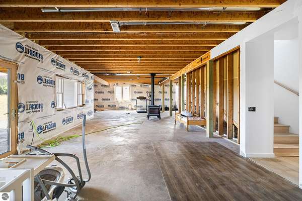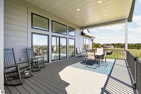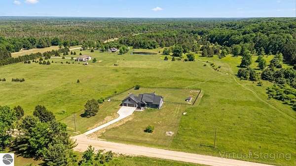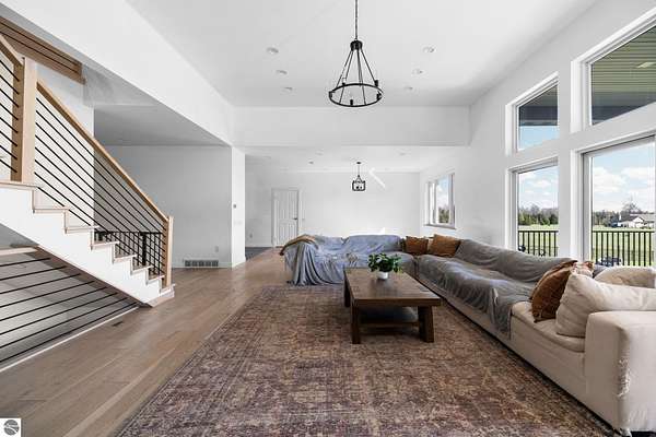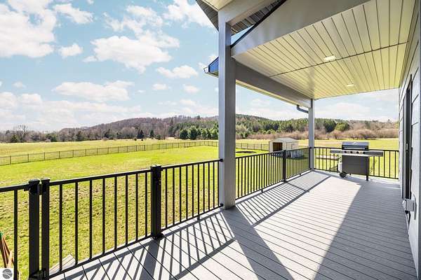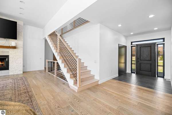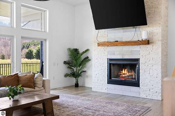 Set on five private acres just minutes from downtown Traverse City, this 2020-built home offers the kind of space, quality, and natural setting that's genuinely hard to find in Northern Michigan. A creek winds through the southeast corner of the property, and the covered back deck is positioned perfectly to catch morning sunrises - the kind of detail that makes a house feel like a place you never want to leave. Inside, the main level spans 2,100 square feet with 12-foot ceilings, an open concept layout, and engineered hardwood floors throughout. The living room anchors the space with a wood-burning fireplace and expansive windows that flood the room with natural light. The kitchen is outfitted with black stainless steel appliances, quartz countertops, lift-up cabinet doors, and a pantry - thoughtfully designed for both everyday living and entertaining. The main floor primary suite is a true retreat, complete with a soaking tub, beautifully tiled walk-in shower, and a walk-in closet. Two additional bedrooms and a full bath round out the main level. Upstairs, 1,350 square feet of additional living space includes two more bedrooms, a bathroom, a dedicated office, and a bonus room with 8-foot ceilings throughout. The 2,000-square-foot unfinished basement is already plumbed for a kitchen, bathroom, and sauna - a blank canvas with serious potential for additional living space, a guest suite, or income-generating use. The covered back deck is fully insulated and weatherproofed, extending the living space outdoors in a way that truly works year-round. Five acres, a firepit, a creek, and a sunrise view - the outdoor experience here is exceptional. All of this, within the Kingsley School District, less than 20 minutes to downtown Traverse City and 15 minutes to shopping, dining, and everyday conveniences.