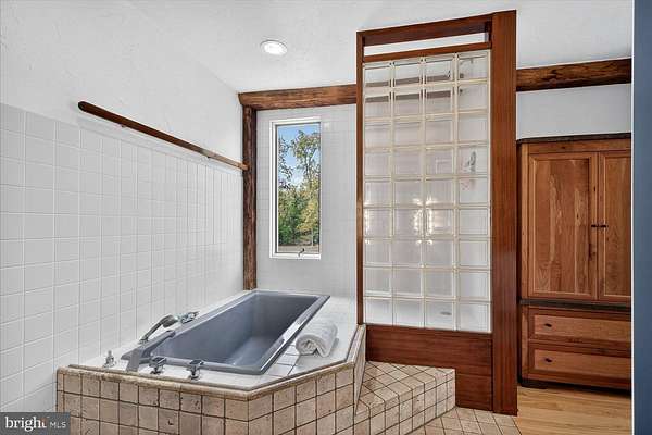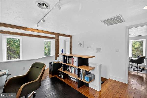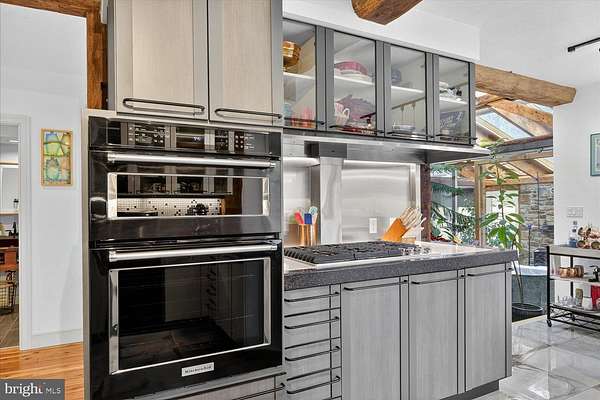 - Built-Ins, Ceiling Fan(s), Dining Area, Eat-In Kitchen, Exposed Beams, Skylight(s), Stall Shower Bathroom, Wood Floors