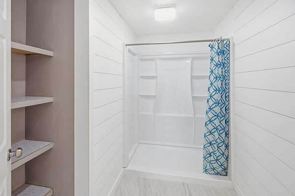 - Ceiling Fan(s), Double Vanity, Fiberglass Stall Shower, Kitchen Island, Laminate Counters, Open Floorplan, Primary Downstairs, Shower/Tub Combo, Soaking Tub, Vaulted Ceiling(s)