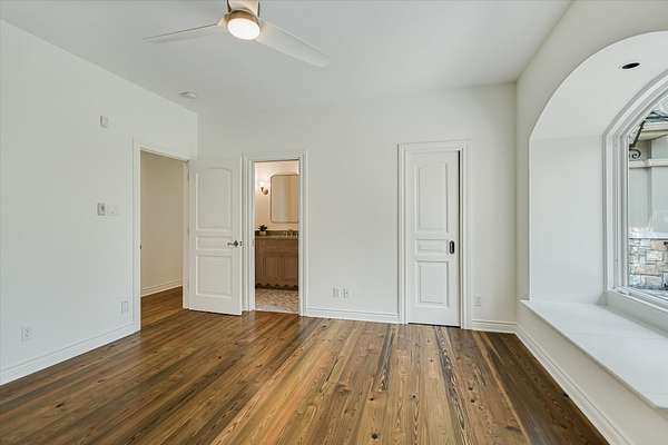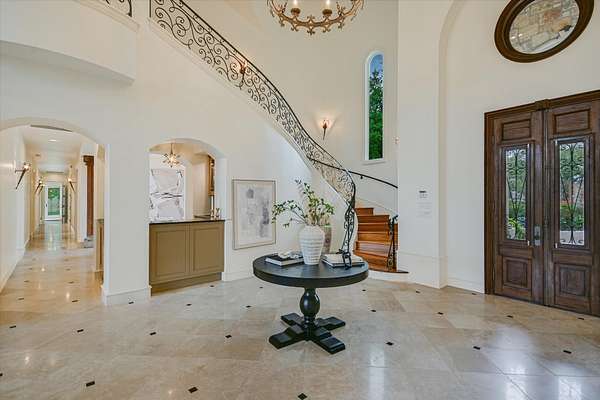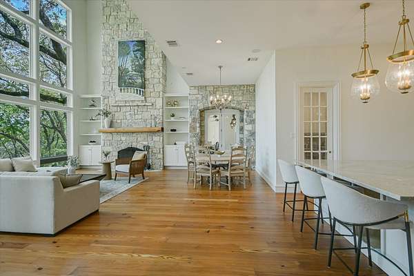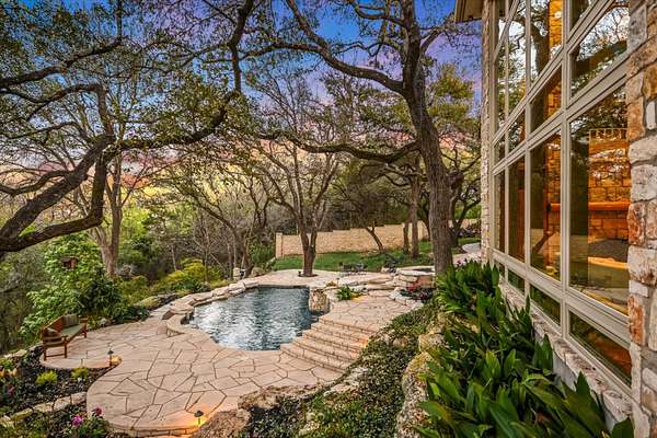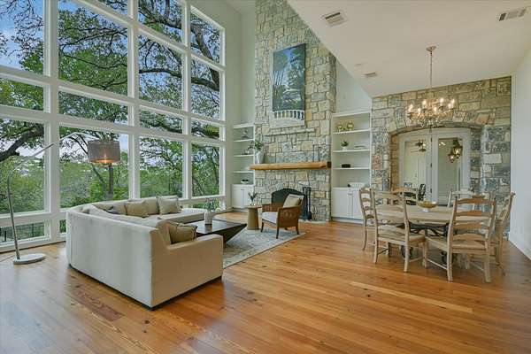 Just beyond, across Rockcliff Road, awaits one of the estate’s most extraordinary features—approximately 330± feet of combined private, deeded Lake Austin shoreline. Mornings begin with paddleboarding at sunrise, afternoons drift into kayaking along the shoreline, and evenings invite effortless boating from your own access point. Nature trails wind through the property, where abundant wildlife enhances the sense of tranquility and connection to the land. Inside, the home has been meticulously updated to reflect today’s most desirable finishes while honoring its architectural roots. Soaring 26-foot ceilings, expansive walls of glass, and a sweeping spiral staircase create a breathtaking sense of scale. Newly refreshed interiors introduce a lighter, more modern palette, complemented by hand-laid Texas stone, Luders limestone detailing across the driveway and patios, warm travertine, and both traditional longleaf pine and rare “sinker” longleaf pine flooring.
