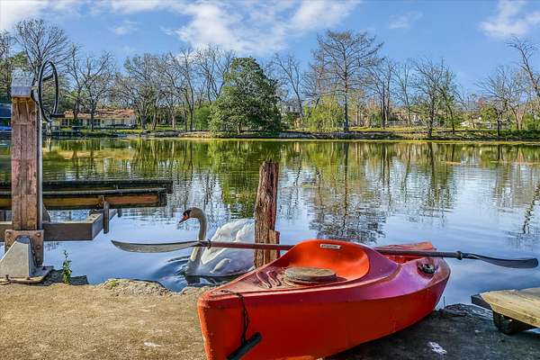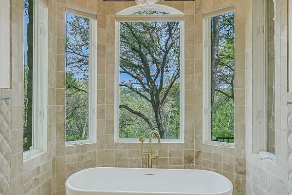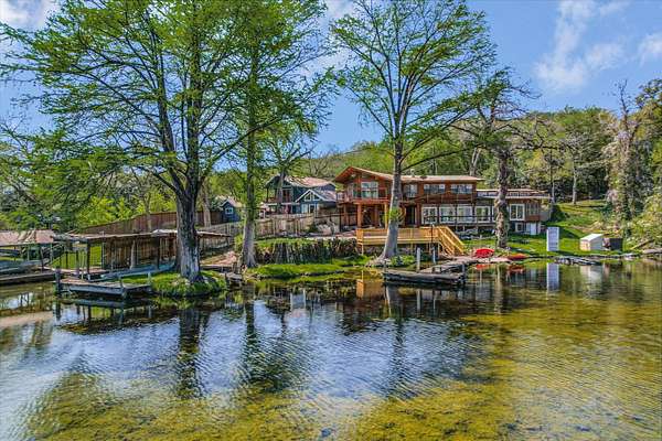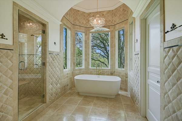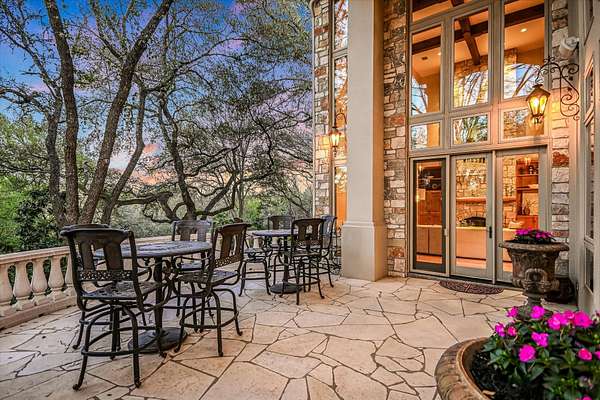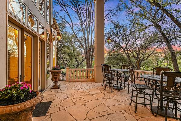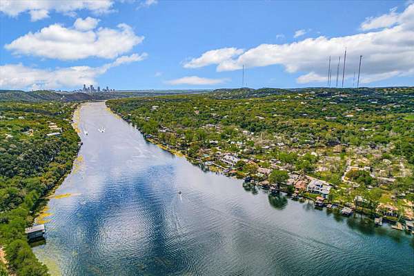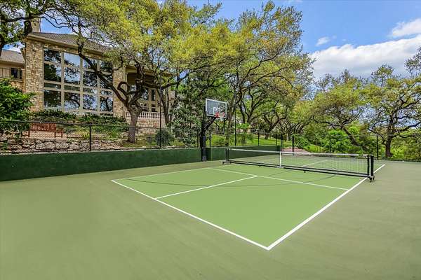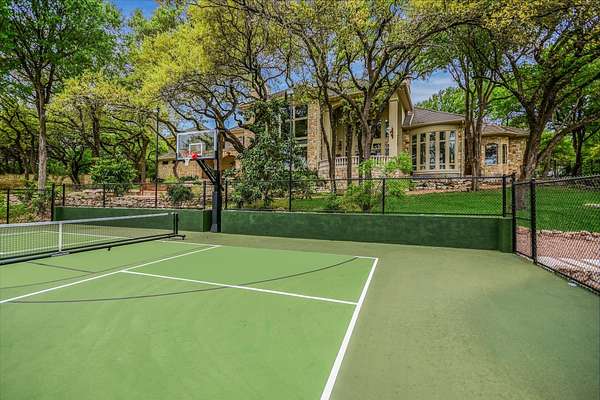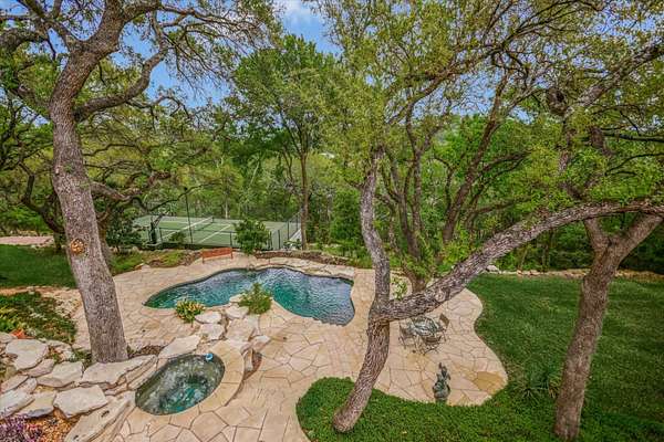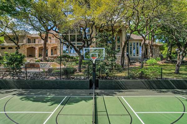 Outdoor living is equally impressive. Two sprawling covered patios overlook a resort-style setting complete with a heated pool, spa, stream, and waterfall features. A newly constructed, oversized lighted pickleball court offers recreation day or night, while panoramic views stretch across the Hill Country to the iconic Pennybacker Bridge in the distance. Even more rare, the estate’s waterfront component includes an additional 270± feet of shoreline and a fully permitted cabin site for a 2,212± square foot residence with an in-ground pool. This creates an extraordinary opportunity to build a bespoke guest retreat or expand into a true legacy compound.