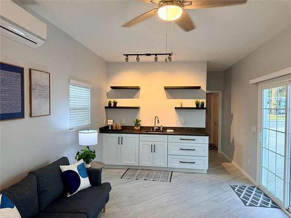 The Grande Suite, less than four years old, is filled with modern, luxurious touches. Tile floors are laid on the diagonal, adding visual interest and elegance. The kitchen area features beautiful lower cabinetry with open shelving above, leathered granite countertops, and a functional, stylish layout. The full bathroom offers a walk-in shower with a modern frameless glass enclosure, showcasing heavy tempered glass and sleek contemporary hardware. The laundry and storage area includes a washer and dryer, along with an additional refrigerator, making extended stays effortless.