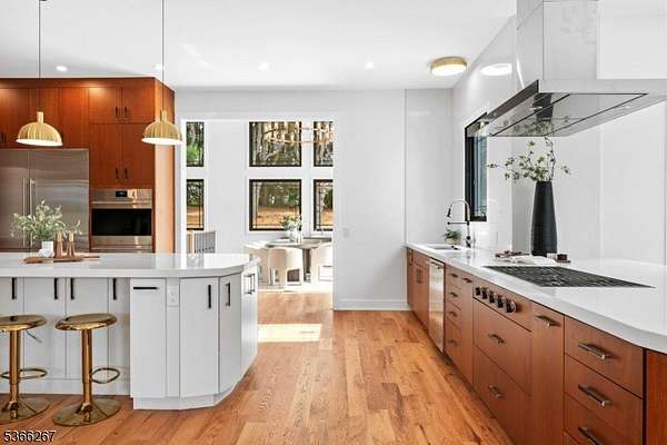 Welcome to Cherry Lane, Mendham's most prestigious address, where this brand-new custom estate crowns 5.94 private acres with breathtaking,unobstructed views. Blending Colorado's rustic grandeur with NYC's sleek modern style, this dream home offers roughly 7,500 square feet of finished livingspace with 6 bedrooms and 5.1 bathrooms. Soaring ceilings, expansive windows, and an airy, open flow create the ultimate setting for both everyday livingand grand entertaining. The dramatic great room stuns with 24-foot beamed ceilings and a striking fireplace, while the main level impresses with 12-footceilings, custom millwork, and seamless transitions throughout. A chef's kitchen showcases real-wood cabinetry with soft-close details, quartz countertops,Wolf appliances, and two oversized islands anchoring the dining and living areas. Hardwood oak floors span the first and second levels, accented by mosaictile in the foyer and lower level. The primary suite is a private sanctuary with dual walk-in closets, dual vanities, a spa-like jet shower, and a soaking tubframed by natural light. Additional highlights include a private in-law suite with built-ins, radiant heated floors, a finished lower level with 10-foot ceilings andglass enclosed wine room. With three-zone HVAC and finishes curated from luxury suppliers, this one-of-a-kind true statement masterpiece delivers bolddesign, panoramic views, and the ultimate modern lifestyle in Mendham's most prestigious setting.