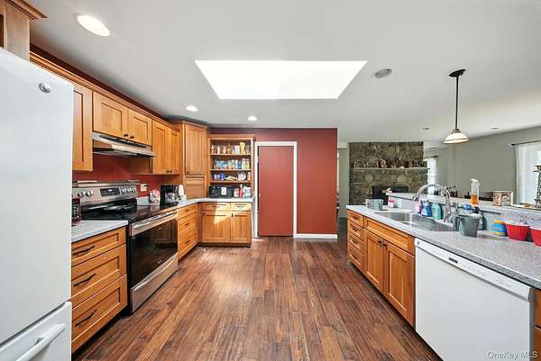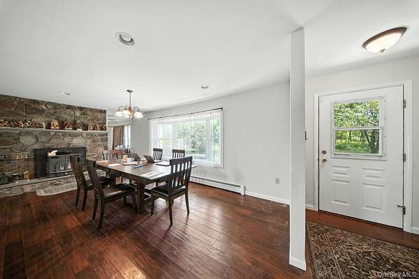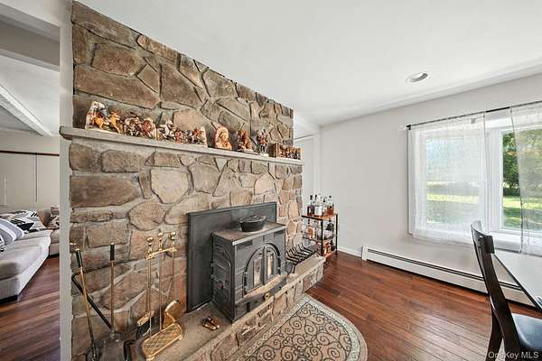Step into the spacious living room, where uniquely designed overhead beams draw the eye upward and invite conversation. The walk-through kitchen, with its breakfast bar island and abundant wood cabinetry, makes morning coffee and family meals feel effortless. In the dining area, a wood-burning stove and a bay window create the perfect backdrop for cozy evenings or holiday gatherings.