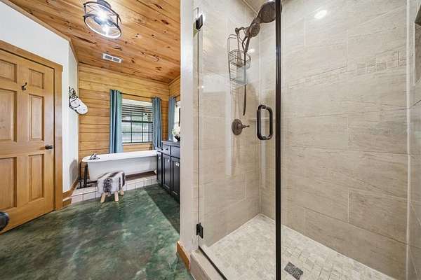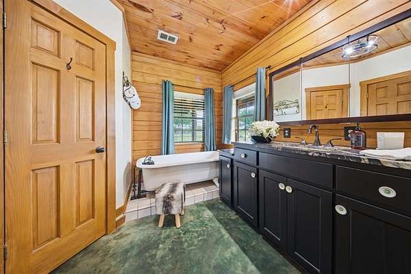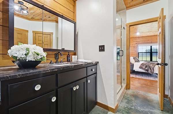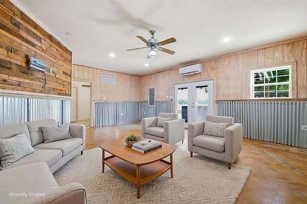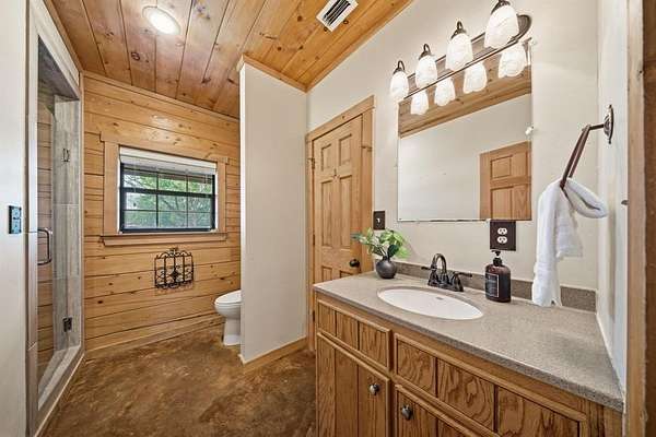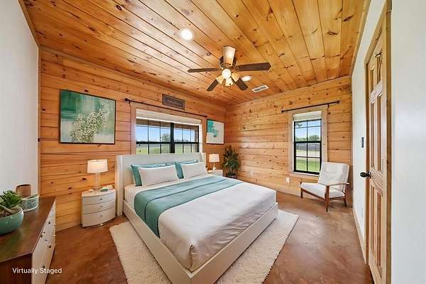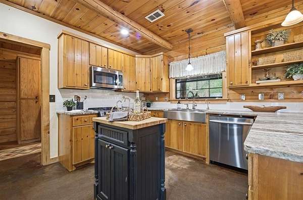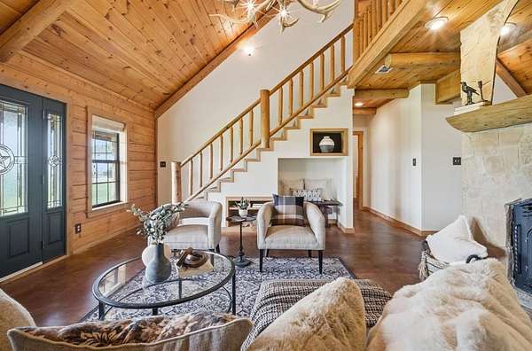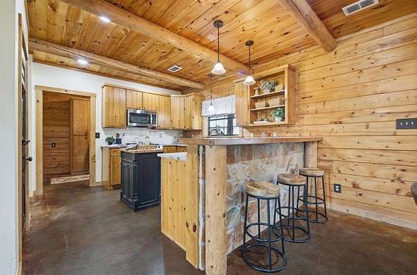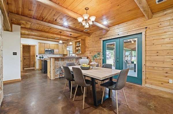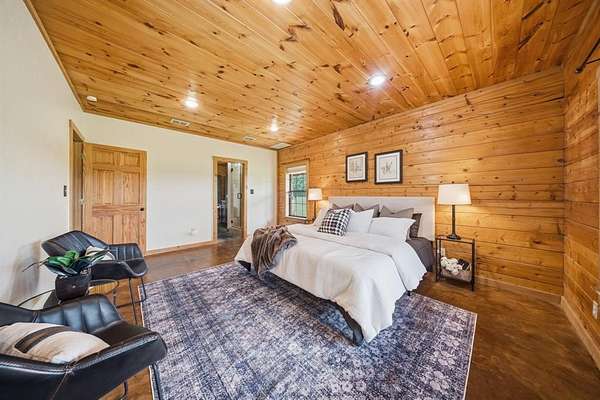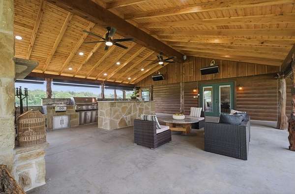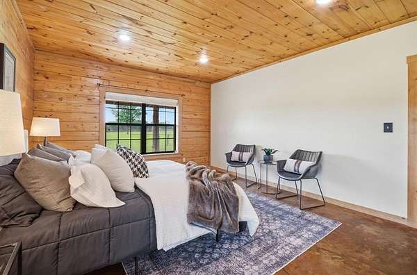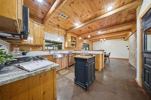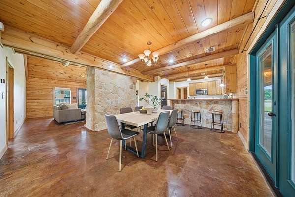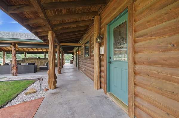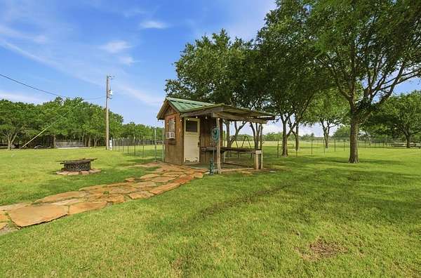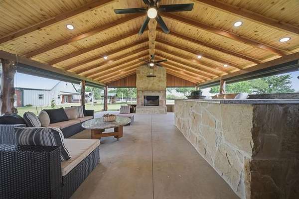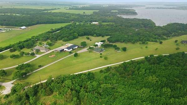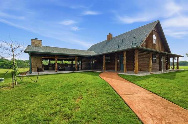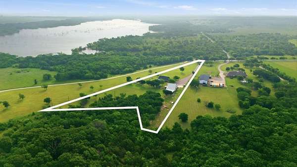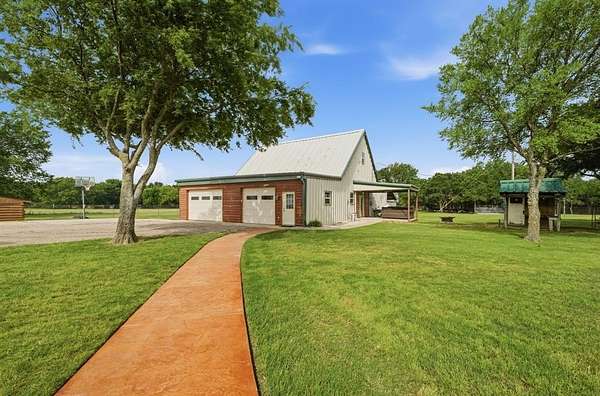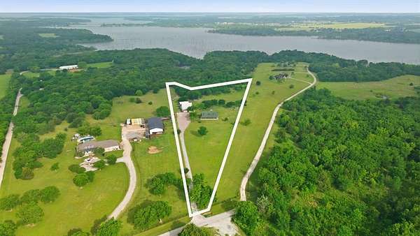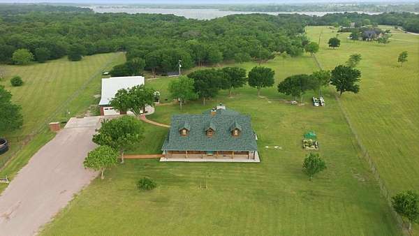 Some homes check boxes, This one transforms how you live! Welcome to Green Acres—where the simple act of coming home becomes a reset, and the noise of the outside world slips quietly out of reach. Discover this stunning property with Gated Entrance on 5 fenced acres! This estate offers rare privacy backing up to Lake Ray Roberts Corps of Engineers land. Designed for both refined living & outdoor enjoyment. Residence showcases rich wood interiors, WB fireplace,& wraparound porch capturing serene, wooded views. The outdoor living experience is truly elevated, featuring fully equipped covered kitchen with granite countertops, ice maker, sink, mini fridge, grill, griddle,& sitting area perfect for entertaining year-round! 2 overhead propane heaters, ceiling fans, electric shades,& fireplace create comfortable setting every season. Property comes with private well,storm cellar, generator hookup,& covered RV storage. The 40x60 detached 4-stall shop-barn offers exceptional versatility, complete with storage & office-man cave,bath, cedar closet. Located just 8.4 miles from DNT extension & in PPISD. Ideal for lake lovers, outdoor enthusiasts, & those seeking private country living! please transaction desk for a full list of upgrades and updates
