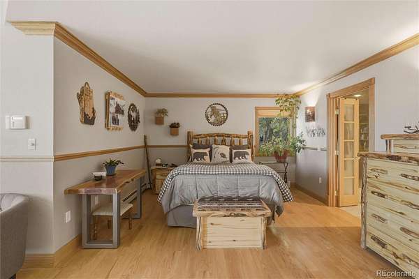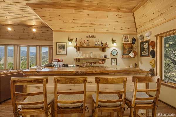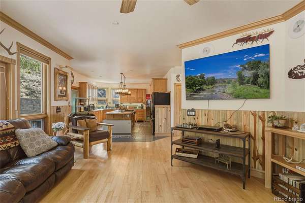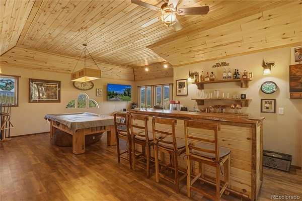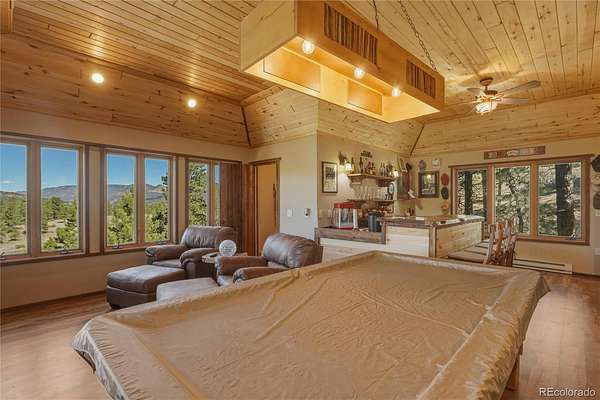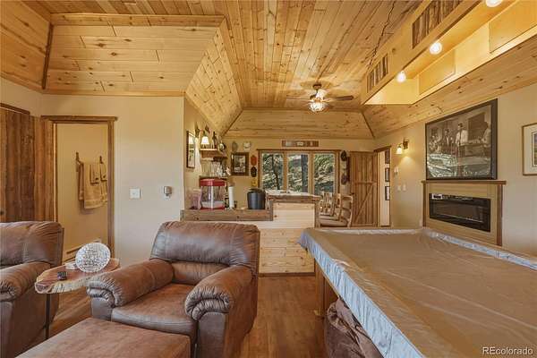The detached 2-car garage provides excellent storage for vehicles, gear, and mountain equipment, and includes a 624 square foot apartment above. This private space features 1 bedroom, 1 bathroom, built-in shelving, a built-in bar area, and an electric fireplace—ideal for guests, extended stays, or additional living flexibility.