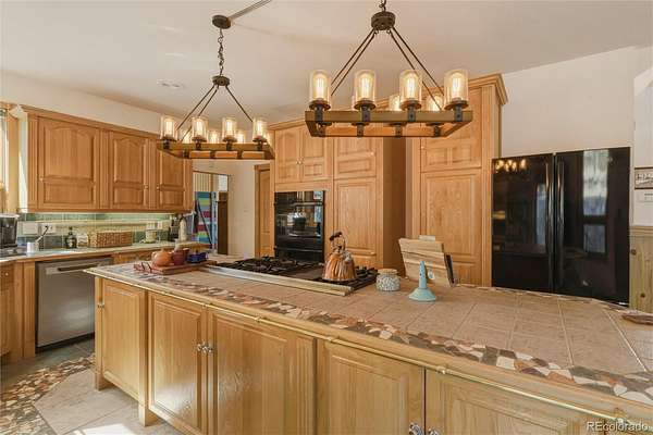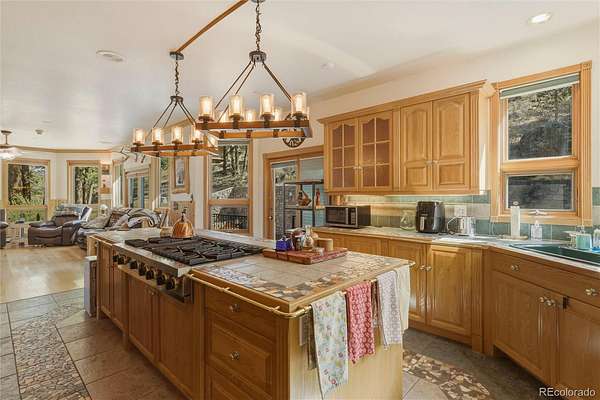 The kitchen is well-equipped for both daily use and entertaining, featuring a double wall oven, Viking 6-burner range with griddle, dishwasher, and refrigerator, along with ample space to gather.