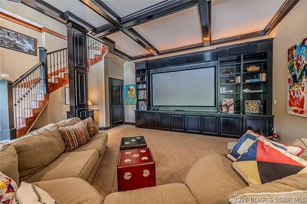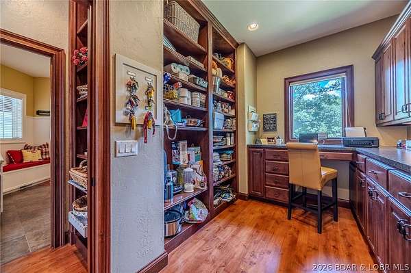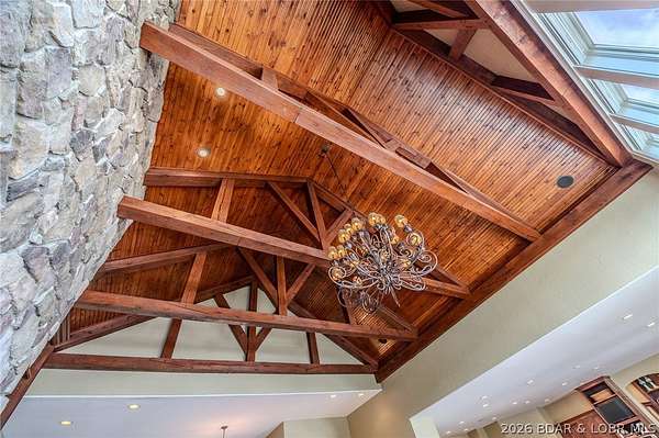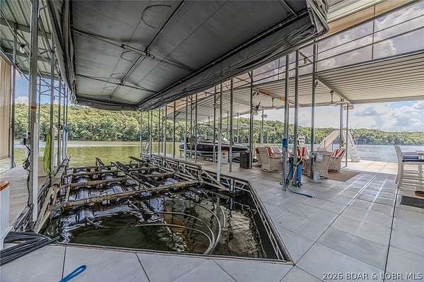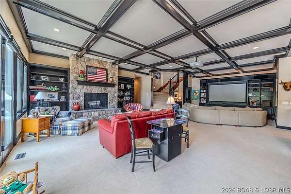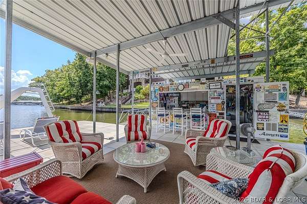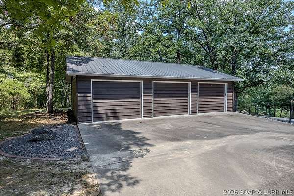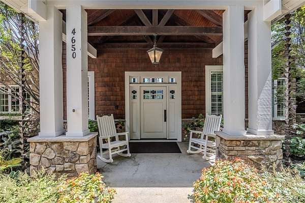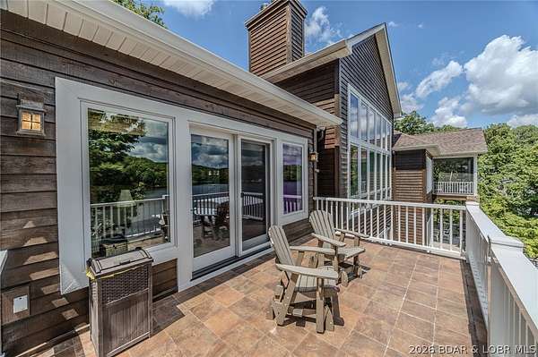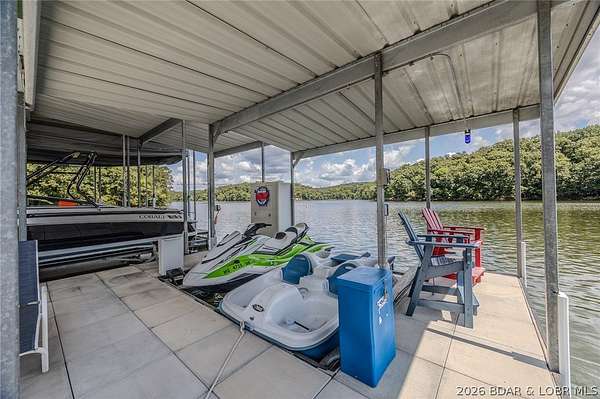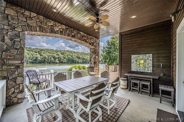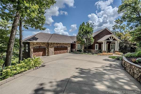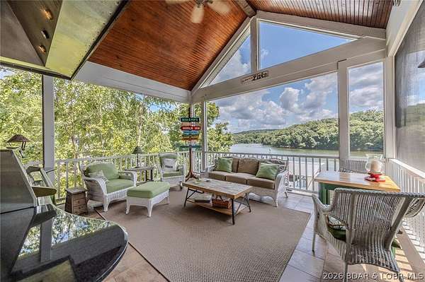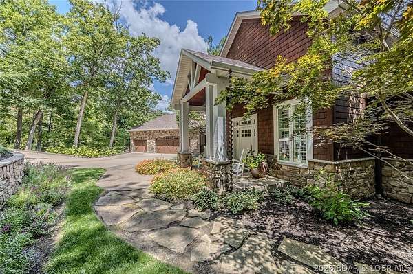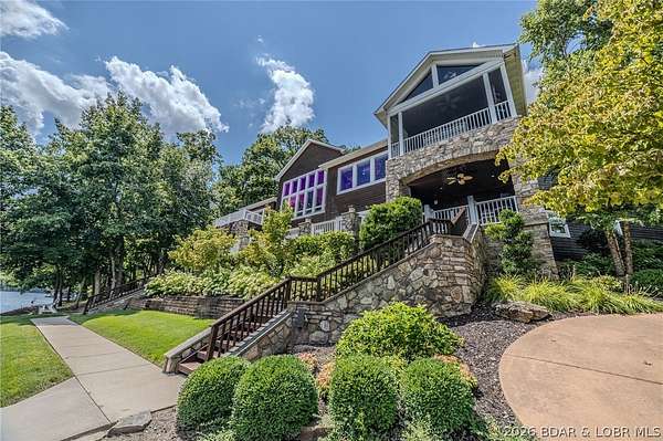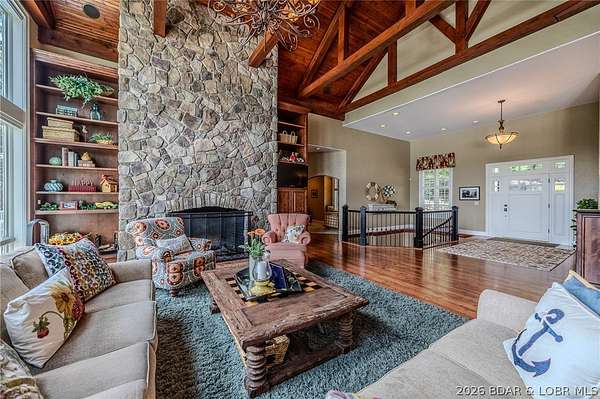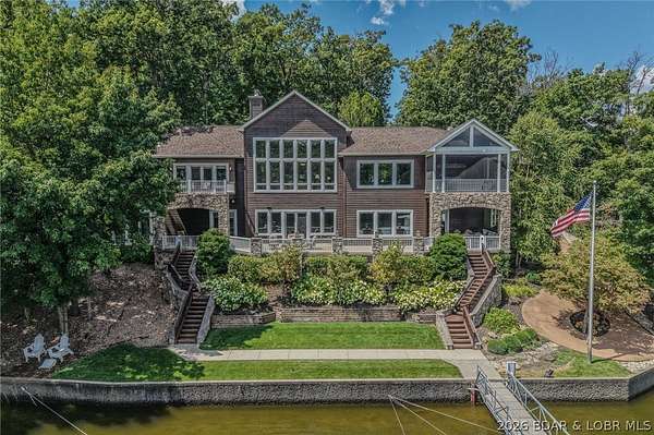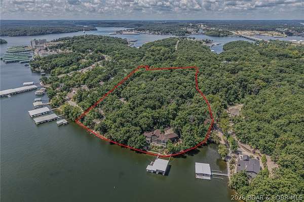 Positioned within an exclusive gated estate situated on 10.7 fully fenced acres in Osage Beach, this exceptional lakefront residence offers rare privacy and sweeping views of untouched state park shoreline. Encompassing 7,500 sq ft with 850' of shoreline, it delivers a refined lake lifestyle with an impressive private dock. A grand entry showcases soaring vaulted beam ceilings and walls of glass capturing breathtaking water views. The chef's kitchen flows seamlessly into expansive living areas and a screened porch with commercial-grade exhaust for year-round entertaining. Featuring 6 bedrooms, a private office/den, 6 full baths, and 2 half baths, the home is anchored by a luxurious primary suite with steam shower and oversized boutique-style closet with island. The walkout lower level offers a theater, bar, and game area, with additional bar service on the main level and dock. The dock includes a 16x48 slip with 30,000 lb lift, 12x30 slip with lift, and double PWC slip with lift. Additional amenities include attached and detached 3-car garages, climate-controlled gym, and RV pad with electric. Pre-listing inspected with a one-year home warranty included.